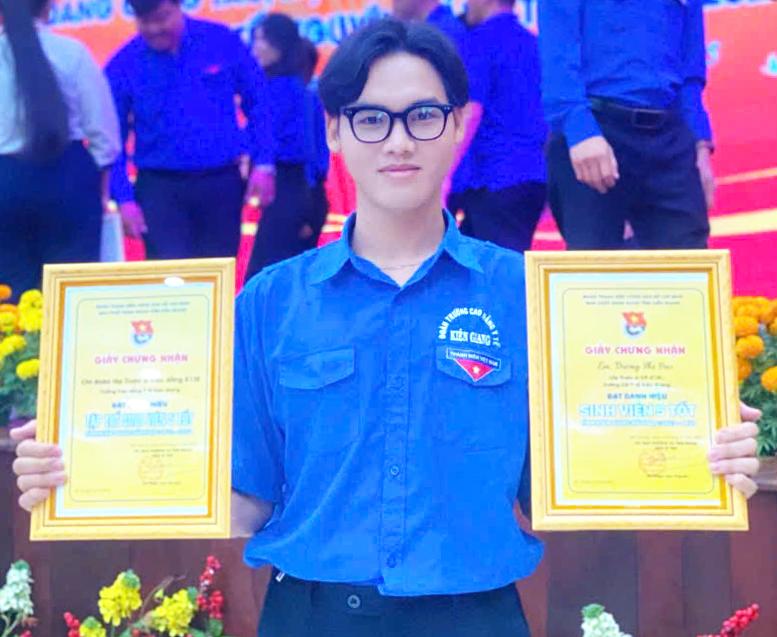 Em Dương Thế Bảo nhận danh hiệu “Sinh viên 5 tốt” cấp tỉnh. Ảnh: MI NI