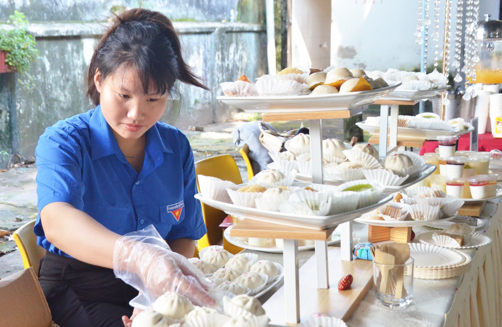 Em Dương Trúc Thùy tham gia phục vụ bữa ăn giữa giờ tại buổi họp mặt do Tỉnh đoàn tổ chức. Ảnh: MI NI