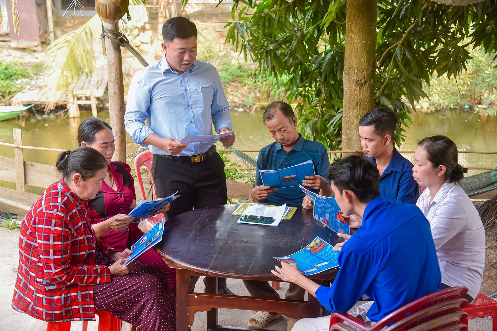 Chi bộ ấp Khánh Hòa tuyên truyền kết quả đại hội đảng bộ các cấp đến đoàn viên, hội viên và Nhân dân trong ấp. Ảnh: THANH NHÃ