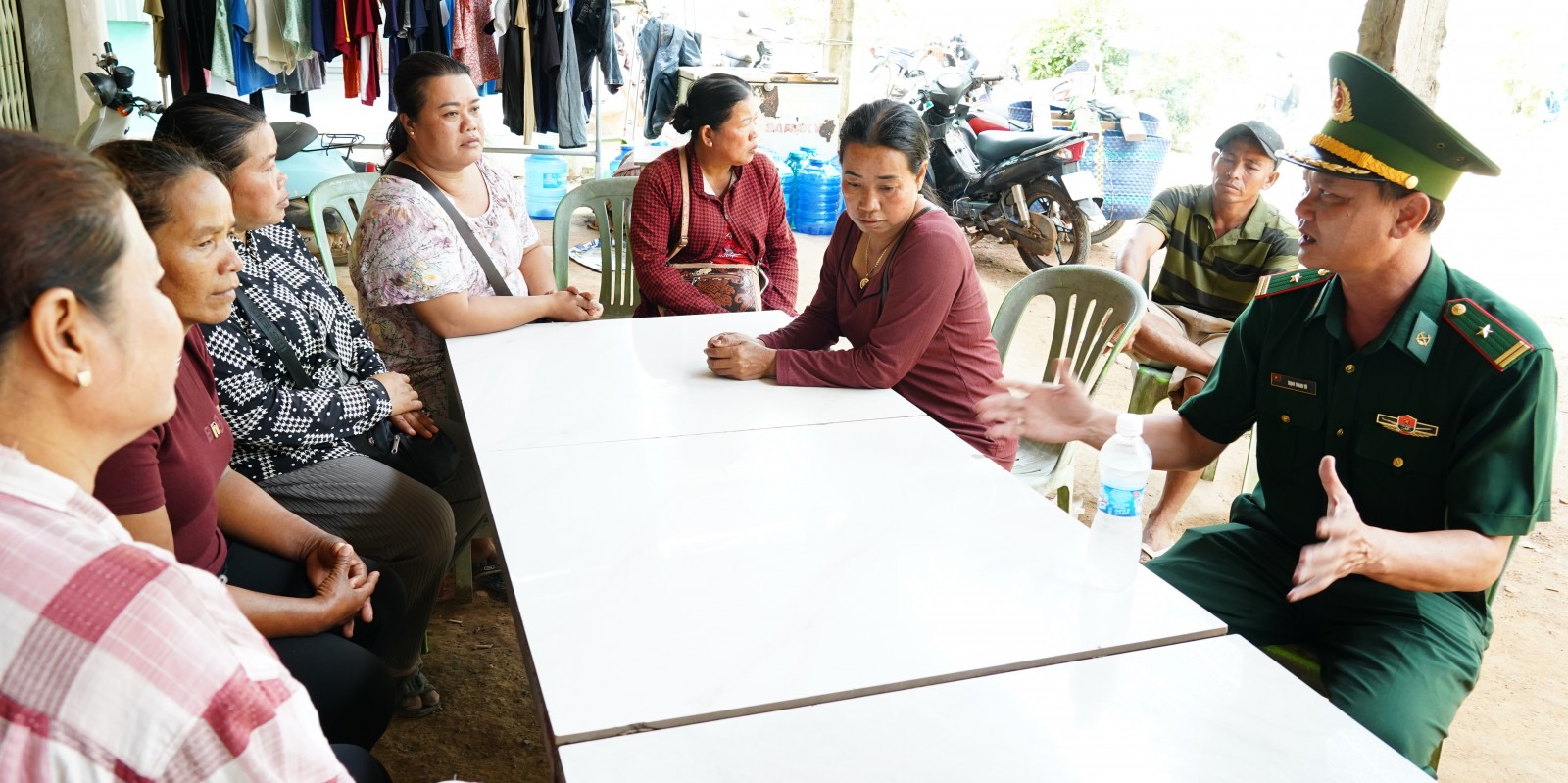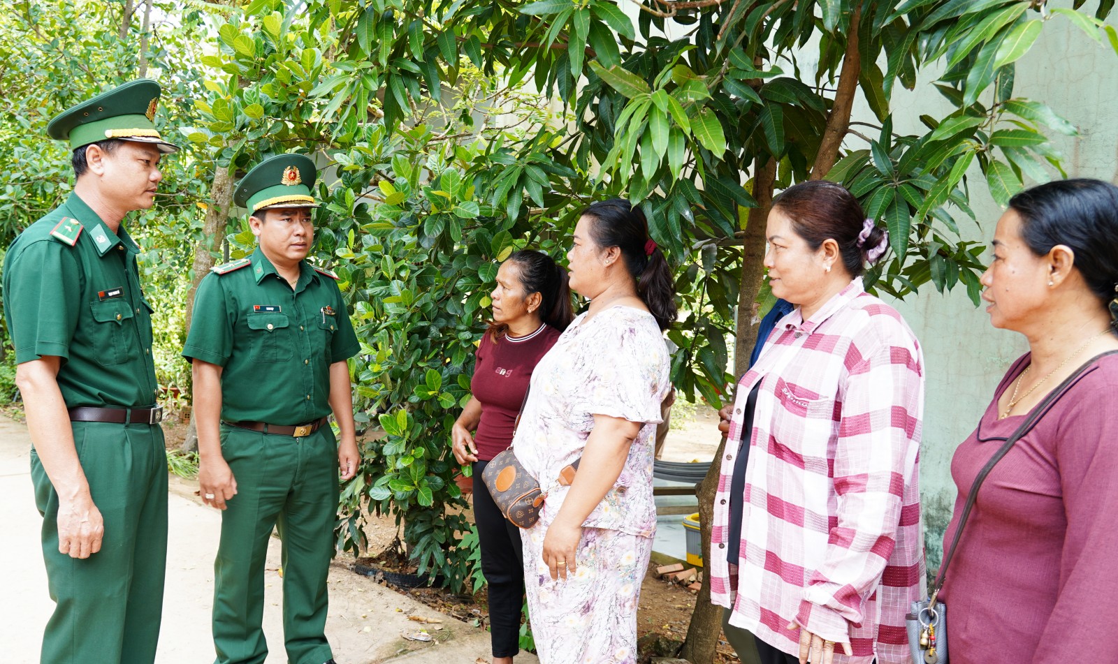 Thiếu tá Trịnh Thanh Tú (bìa trái) gặp gỡ người dân trên địa bàn phụ trách để tuyên truyền các quy định về qua lại biên giới.