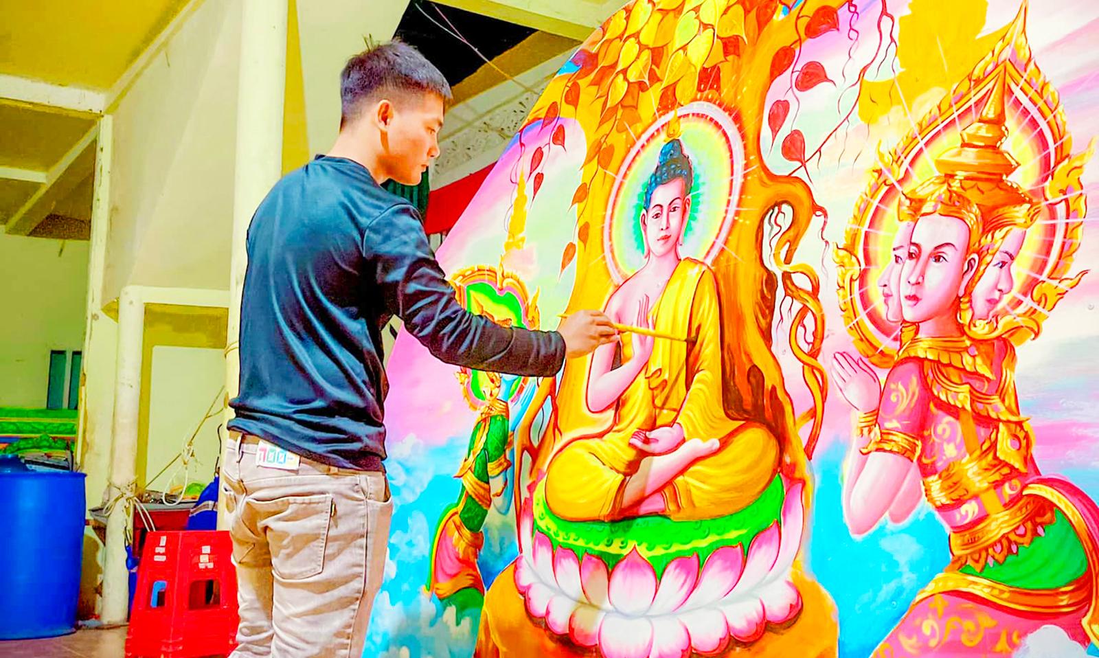 Trong ánh nắng buổi sớm, tiếng cọ vẽ khẽ chạm trên mặt gỗ, mùi sơn mới hòa cùng tiếng chuông chùa ngân dài. Đó là khung cảnh quen thuộc trong ngày làm việc của anh Danh Thành Đạt, ngụ xã Định Hòa. Từ đôi bàn tay đầy màu sơn, anh tỉ mỉ tô từng họa tiết hoa sen, Phật Thích Ca, cây bồ đề… tạo nên những bức tranh sống động. Sinh ra ở vùng đất giàu nghệ thuật truyền thống Khmer, nơi âm nhạc, kiến trúc và hội họa hòa quyện, anh Đạt sớm bị cuốn hút bởi vẻ đẹp của hoa văn chùa. “Nhà tôi gần chùa, nên từ nhỏ hay chạy qua xem các chú thợ vẽ. Nhìn họ tô từng đường nét, tôi mê lắm”, anh Đạt kể.