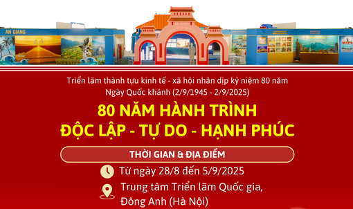 Hướng tới kỷ niệm 80 năm Ngày Quốc khánh nước Cộng hòa Xã hội Chủ nghĩa Việt Nam (2/9/1945 – 2/9/2025), tỉnh An Giang tham gia Triển lãm thành tựu kinh tế - xã hội toàn quốc, với chủ đề “80 năm hành trình Độc lập - Tự do - Hạnh phúc”, tại Trung tâm Triển lãm Quốc gia, Đông Anh (Hà Nội). Không gian trưng bày của An Giang được thiết kế quy mô 387,5m², giới thiệu hình ảnh một vùng đất giàu truyền thống lịch sử, văn hóa và đầy khát vọng vươn lên.