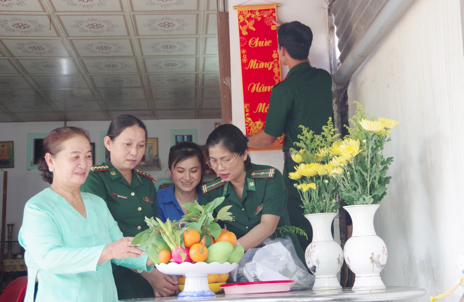 Bên cạnh đó, Hội Phụ nữ Bộ đội Biên phòng tỉnh, Đoàn Thanh niên xã, Hội Liên hiệp Phụ nữ xã và cán bộ, chiến sĩ Đồn Biên phòng Cửa khẩu quốc tế Vĩnh Xương đến hỗ trợ bà Nguyễn Thị Pháo, gia đình chính sách (ngụ tổ 16, ấp 1) dọn dẹp, chỉnh trang nhà cửa, chuẩn bị đón Tết.