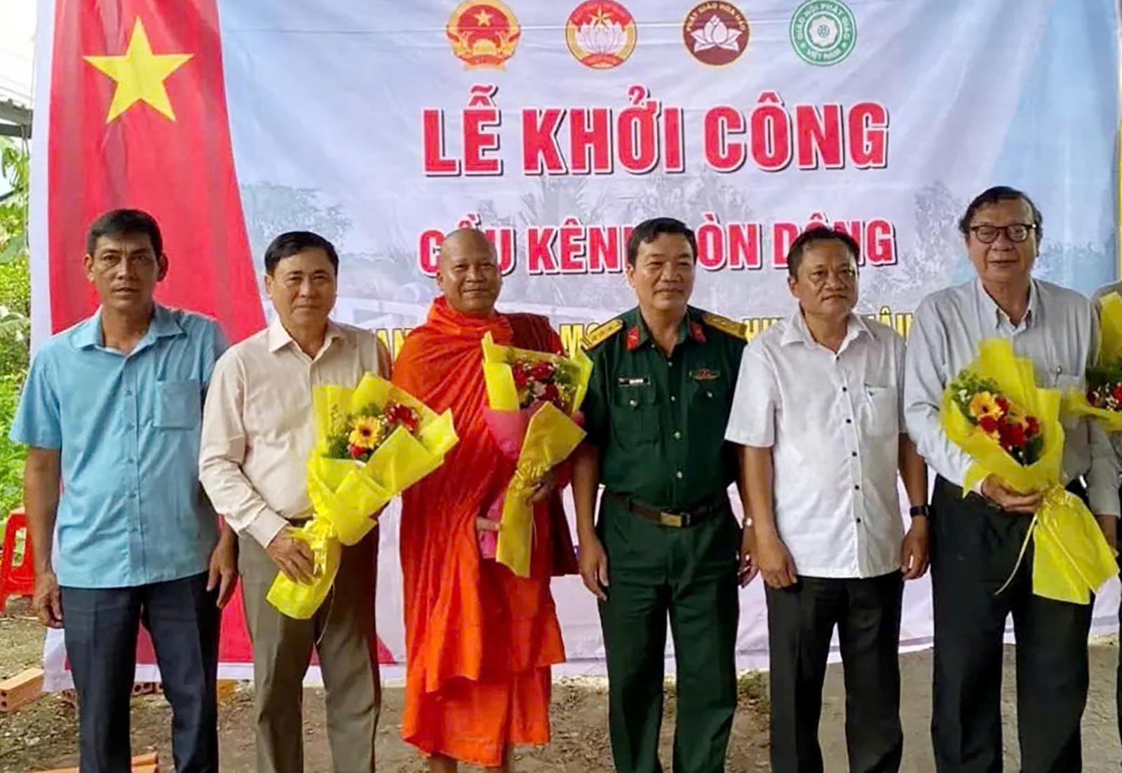 Chủ tịch Hội Hữu nghị Việt Nam - Campuchia tỉnh An Giang Lê Thành Tạc (thứ 2, từ trái qua) nhận hoa tại lễ khởi công cầu giao thông nông thôn. Ảnh: THANH THANH