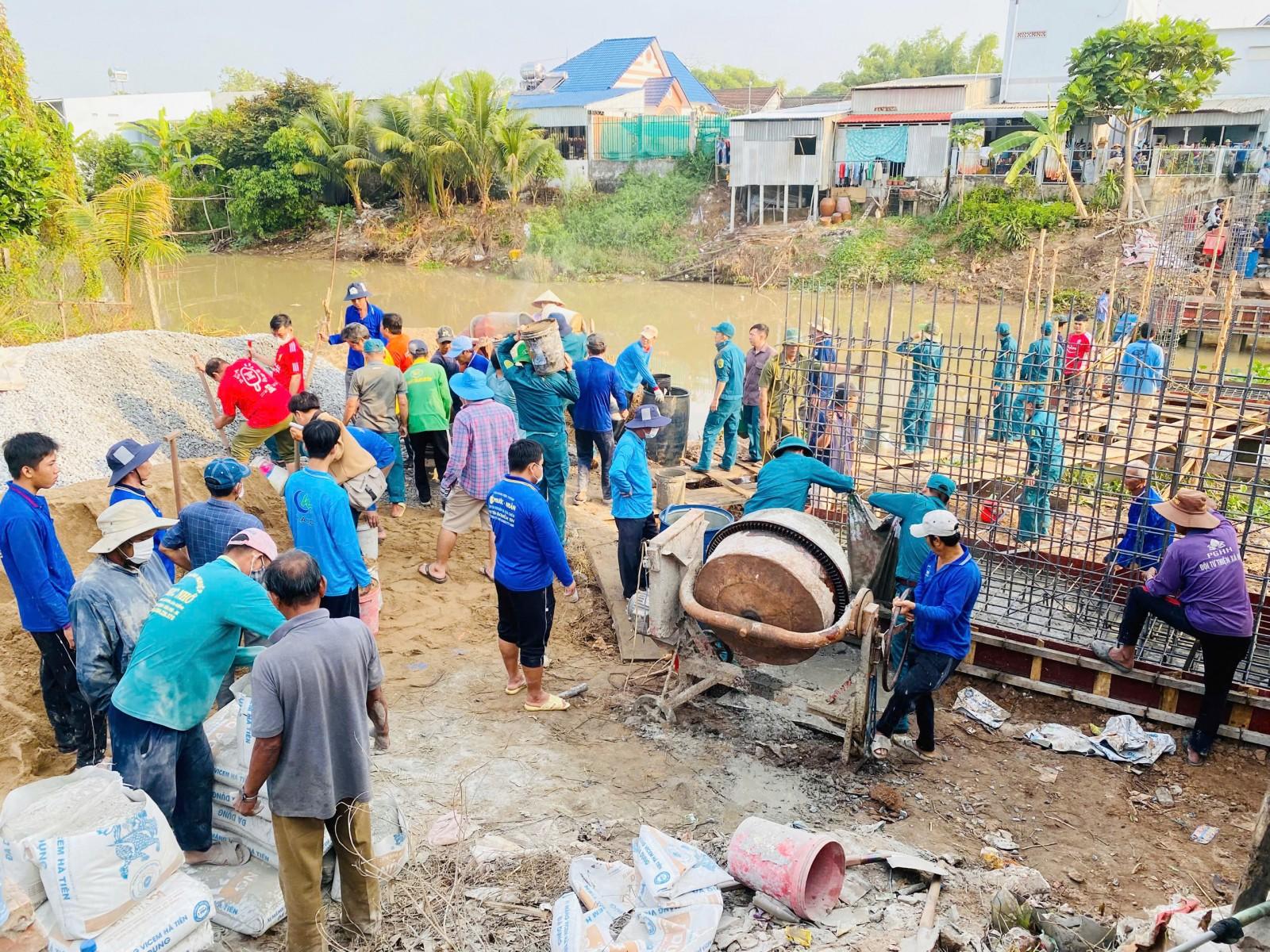 Ông Hùng cho biết, không khí thi công càng sôi nổi khi người dân cùng cán bộ, chiến sĩ Lữ đoàn Pháo binh 6 Quân khu 9, Công an xã, dân quân tự vệ địa phương. Trong buổi sớm mai, màu xanh áo lính hòa cùng màu áo nông dân cùng trộn bê tông, vác từng bao đá để nối đôi bờ Kênh 7 khiến ông Hùng xúc động. “Có mấy chú bộ đội, công an tham gia nên công trình làm nhanh hơn. Bà con ai cũng thương, trân quý tình cảm, sự cống hiến của những người lính trẻ đối với quê hương Châu Phú”, ông Hùng chia sẻ.