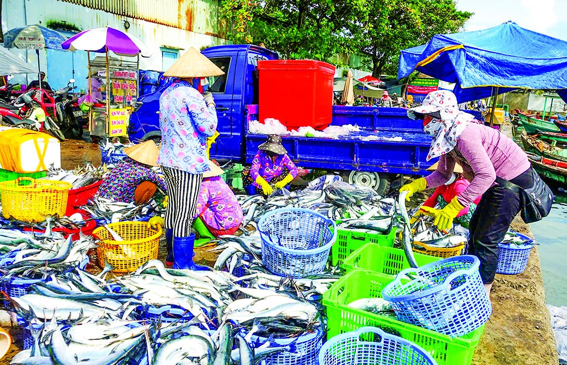 Các tàu cá liên tiếp từ ngoài khơi vào cảng; trên bờ người dân tấp nập phân loại hải sản, đóng thùng đưa đi tiêu thụ. Cá ngừ, cá nhồng, cá thu, cá tráp, cá nhám, mực, ốc các loại... xuất hiện dày đặc.
