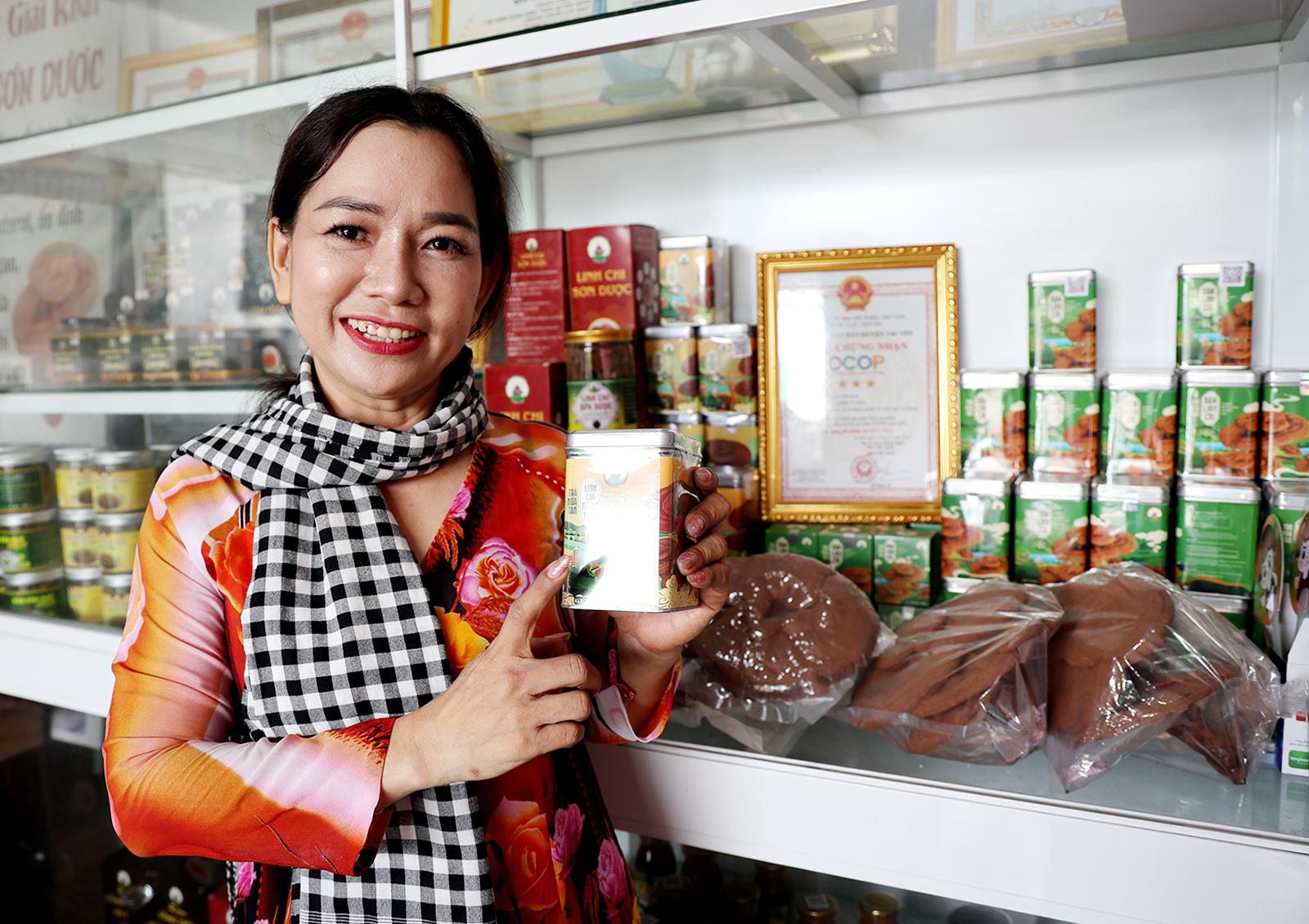 Bà Châu Thị Nương cho biết, cùng với nhu cầu thị trường về các loại nấm ăn, nấm dược liệu, cơ sở sản xuất các sản phẩm như: Nấm mối đen, nấm linh chi, nấm đông trùng hạ thảo, nấm bào ngư. Bên cạnh đó là sản phẩm qua chế biến: Nấm mối đen sấy thăng hoa, chà bông, snack; nấm đông trùng hạ thảo sấy khô làm trà, ngâm rượu, ngâm mật ong; nấm linh chi xay nhuyễn làm trà hòa tan, ngâm rượu, phơi khô, làm kiểng; nấm bào ngư và nấm rơm chế biến snack… “Sản lượng các trại nấm đạt hơn 10 tấn/năm; doanh thu mỗi năm 12 tỷ đồng. Cơ sở còn giải quyết việc làm cho cho khoảng 30 người lao động địa phương, với mức thu nhập từ 6 - 9 triệu đồng/tháng”, bà Nương chia sẻ.
