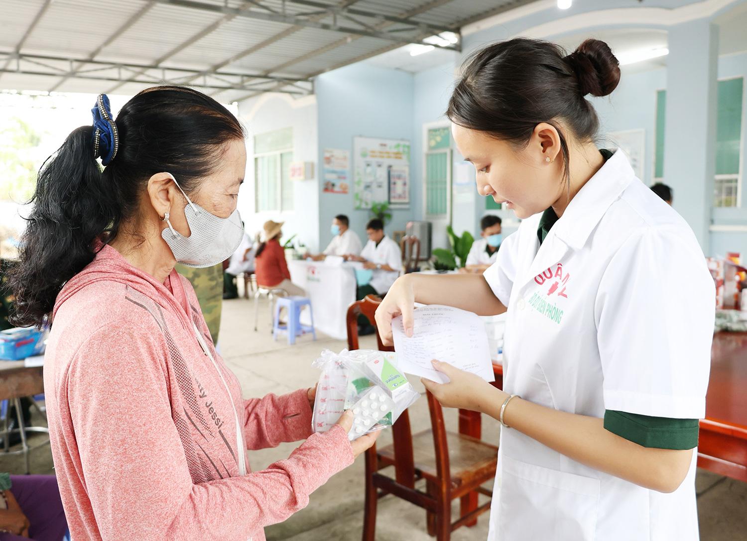 Trung úy Vũ Thị Quế Trâm hướng dẫn người bệnh cách dùng thuốc. Ảnh: TIẾN VINH