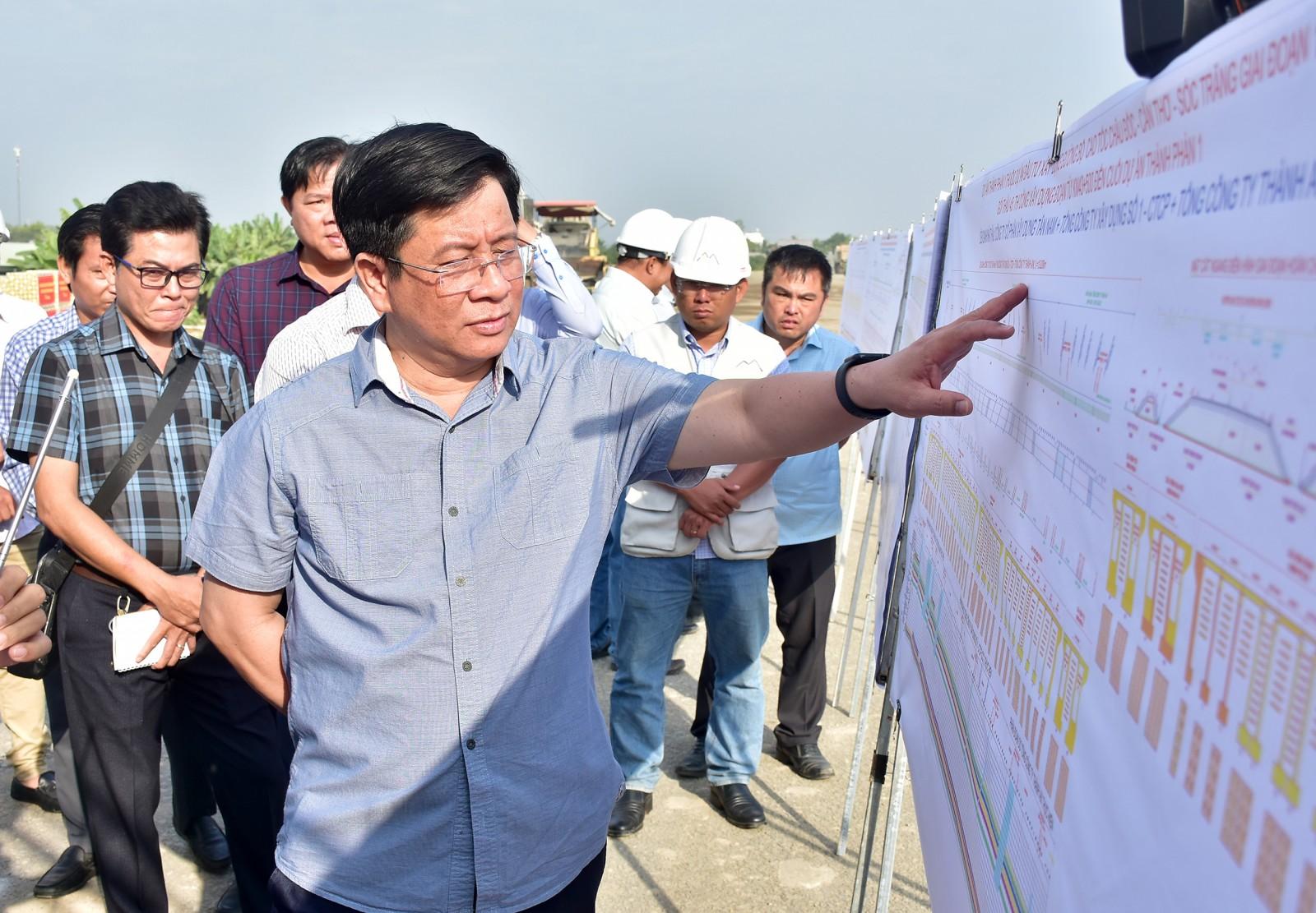 Chủ tịch UBND tỉnh An Giang Hồ Văn Mừng nghe các nhà thầu báo cáo tiến độ thi công từng gói thầu.