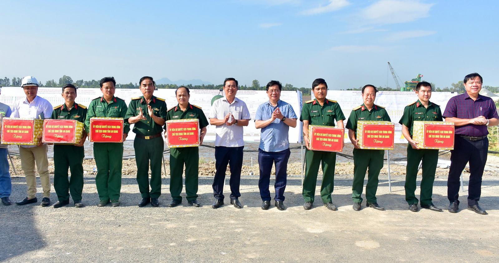 Dịp này, Chủ tịch UBND tỉnh An Giang Hồ Văn Mừng đã tặng quà động viên lực lượng đang thi công tại công trường.