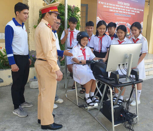 Học sinh Trường Trung học cơ sở An Thới 2, đặc khu Phú Quốc trải nghiệm lái xe an toàn trên thiết bị mô phỏng tại buổi tuyên truyền pháp luật về trật tự, an toàn giao thông do Phòng Cảnh sát giao thông, Công an tỉnh tổ chức ngày 29/12/2025. Ảnh: NGUYỄN HƯNG
