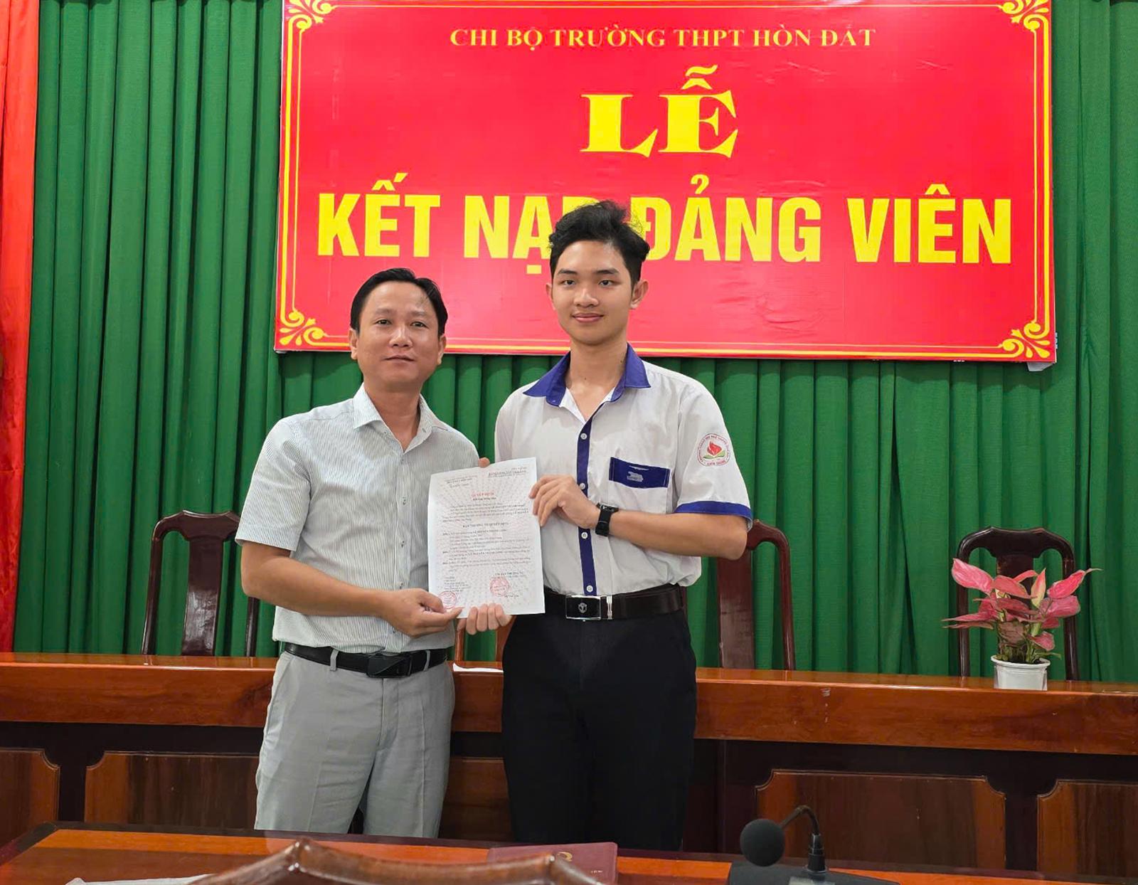 Ngay từ khi còn là học sinh Trường THPT Hòn Đất, Lê Nguyễn Thành Long (hiện là sinh viên năm nhất Trường Đại học Y Dược Cần Thơ) đã xác định mục tiêu phấn đấu trở thành đảng viên. Với thành tích học tập nổi bật, tinh thần chuyên cần và phẩm chất đạo đức tốt, Thành Long được Chi bộ Trường THPT Hòn Đất bồi dưỡng, kết nạp Đảng trong năm học 2024 - 2025. “Được đứng trong hàng ngũ của Đảng giúp tôi trưởng thành hơn, có thêm động lực rèn luyện, học tập để xứng đáng với vai trò đảng viên trẻ”, Thành Long chia sẻ.