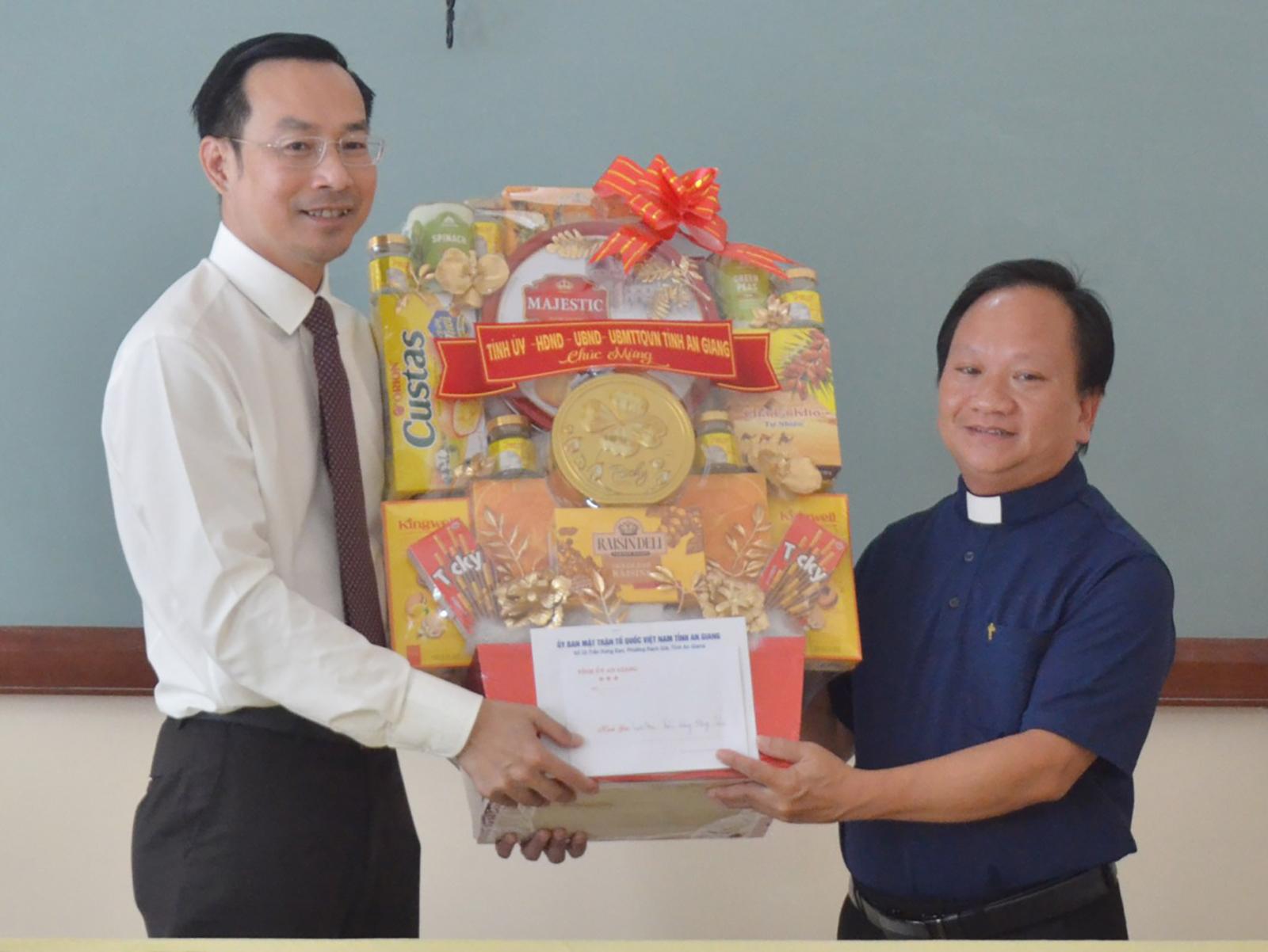 Phó Bí thư Thường trực Tỉnh ủy, Chủ tịch HĐND tỉnh An Giang Nguyễn Thanh Nhàn (bìa trái) tặng quà Giáo xứ Rạch Sỏi.