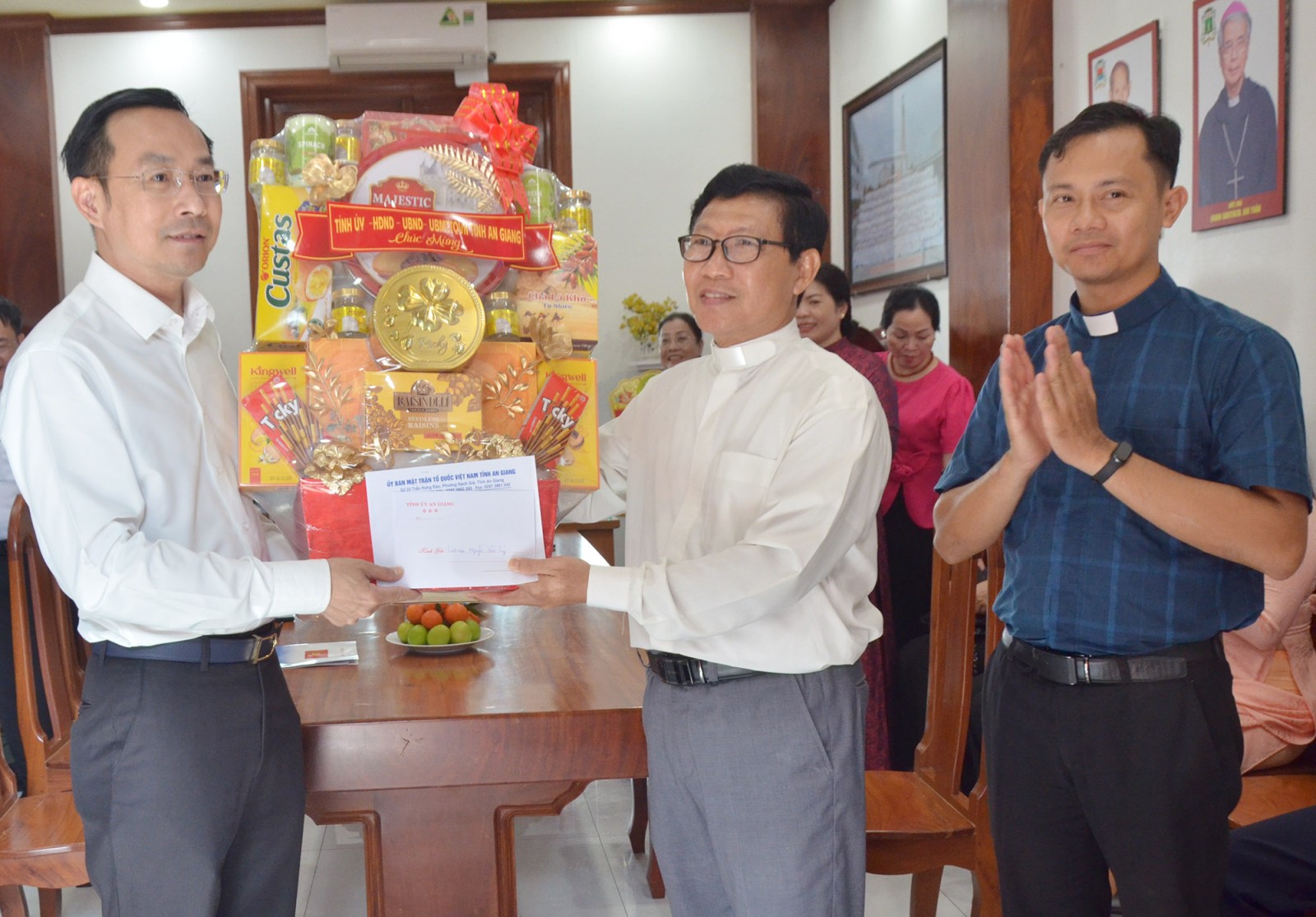 Phó Bí thư Thường trực Tỉnh ủy, Chủ tịch HĐND tỉnh An Giang Nguyễn Thanh Nhàn (bìa trái) thăm, tặng quà Giáo xứ Rạch Giá.