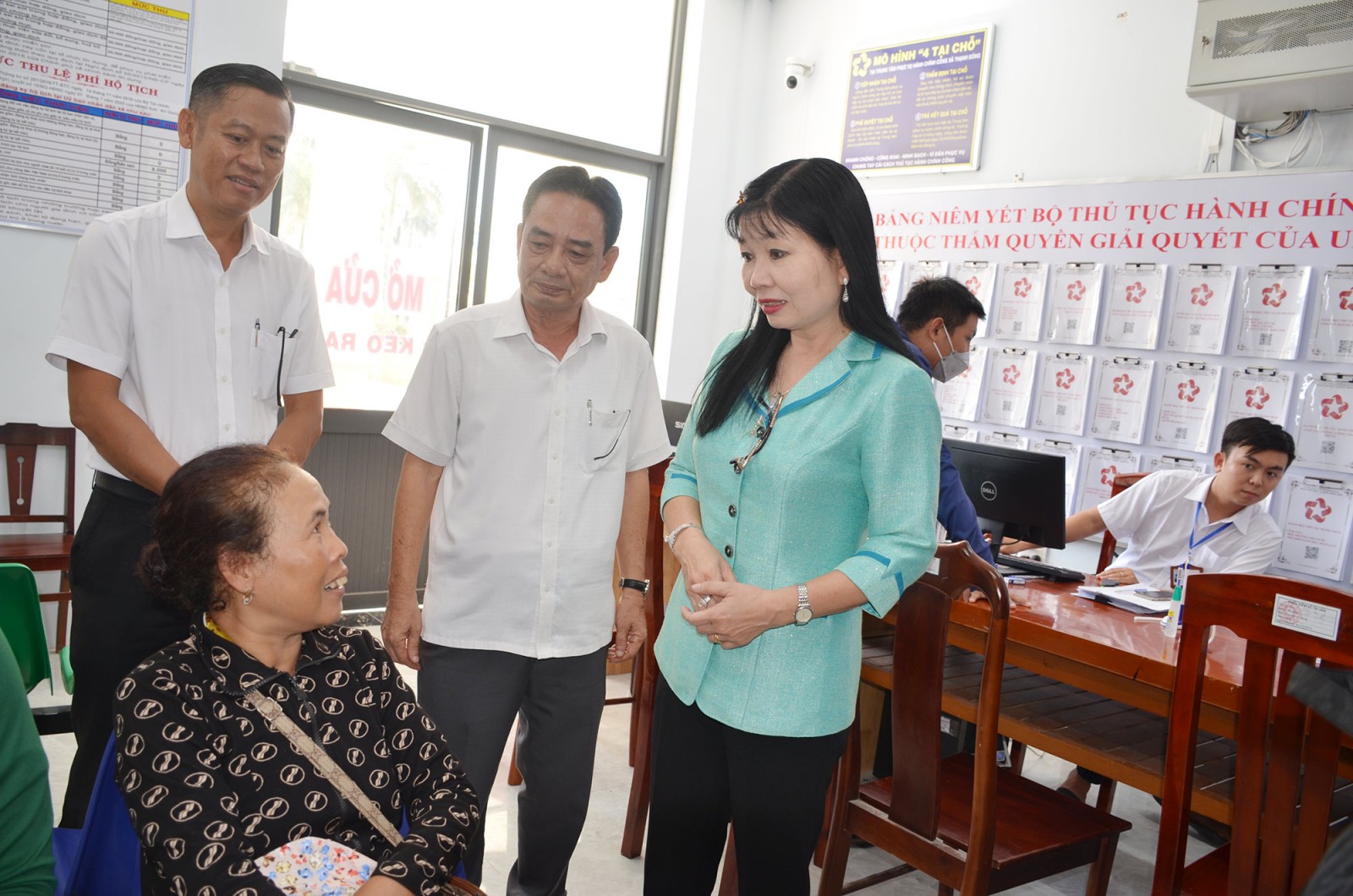 Phó Bí thư Tỉnh ủy An Giang Trần Thị Thanh Hương (bên phải) thăm hỏi người dân khi đến làm thủ tục hành chính tại Trung tâm Phục vụ hành chính công xã Thạnh Đông.