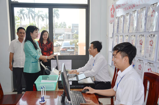 Đồng chí Trần Thị Thanh Hương thăm, động viên cán bộ công chức làm việc tại Trung tâm Phục vụ hành chính công xã Thạnh Đông.