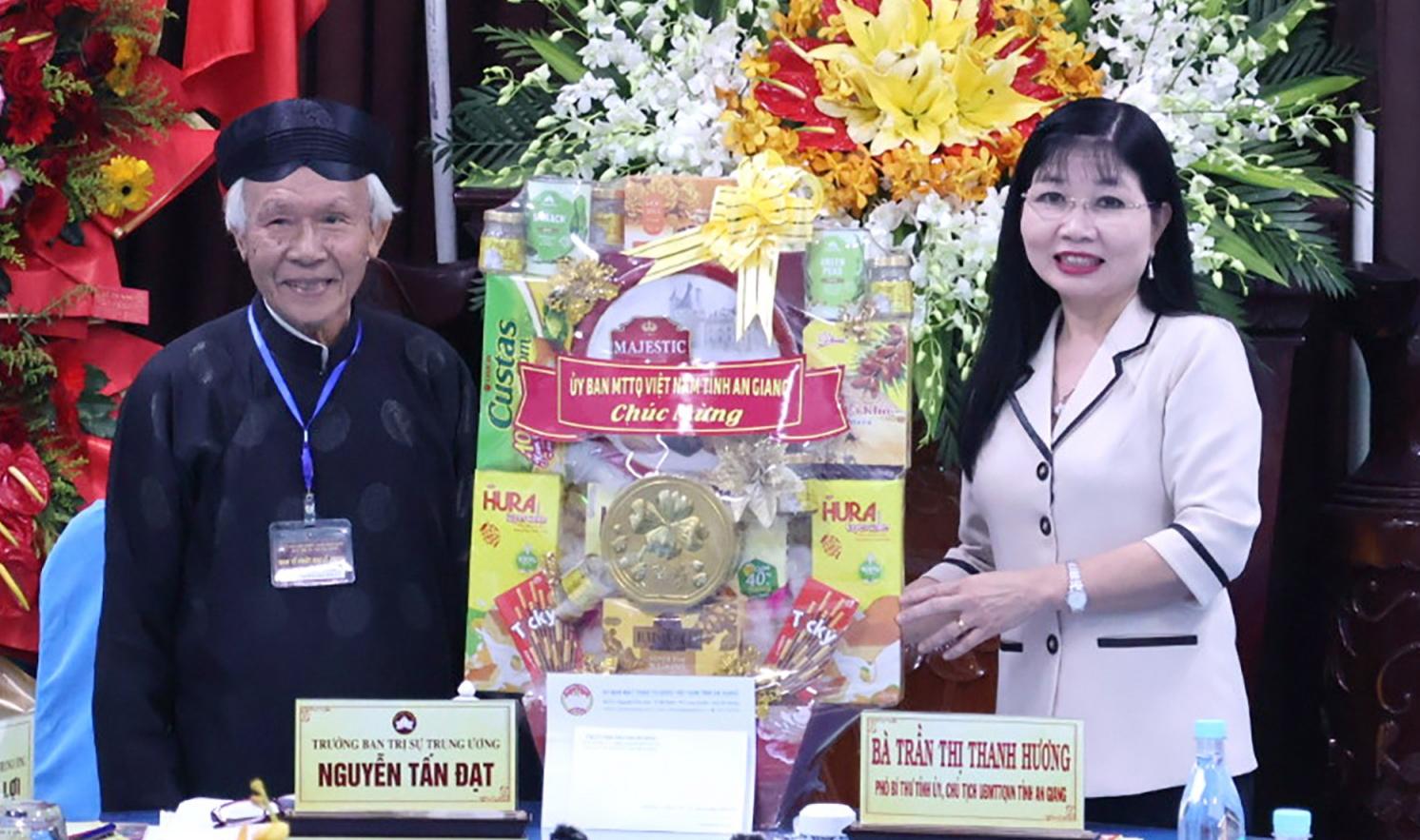 Phó Bí thư Tỉnh ủy, Trưởng đoàn Đại biểu Quốc hội đơn vị tỉnh An Giang, Chủ tịch Ủy ban MTTQ Việt Nam tỉnh An Giang Trần Thị Thanh Hương tặng quà chúc mừng Ban Trị sự Trung ương Giáo hội Phật giáo Hòa Hảo.