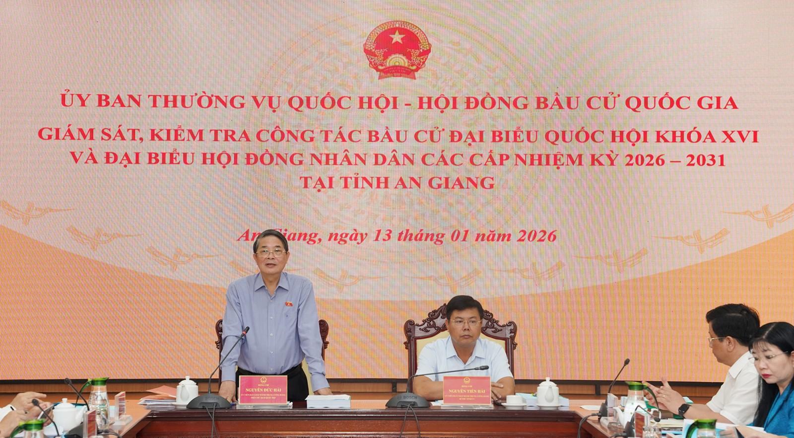 Phát biểu chỉ đạo tại buổi làm việc, Phó Chủ tịch Quốc hội, Ủy viên Hội đồng Bầu cử quốc gia Nguyễn Đức Hải đánh giá cao sự chủ động, quyết liệt của tỉnh An Giang trong triển khai các bước chuẩn bị bầu cử, đảm bảo đúng tiến độ, trình tự và quy định pháp luật.