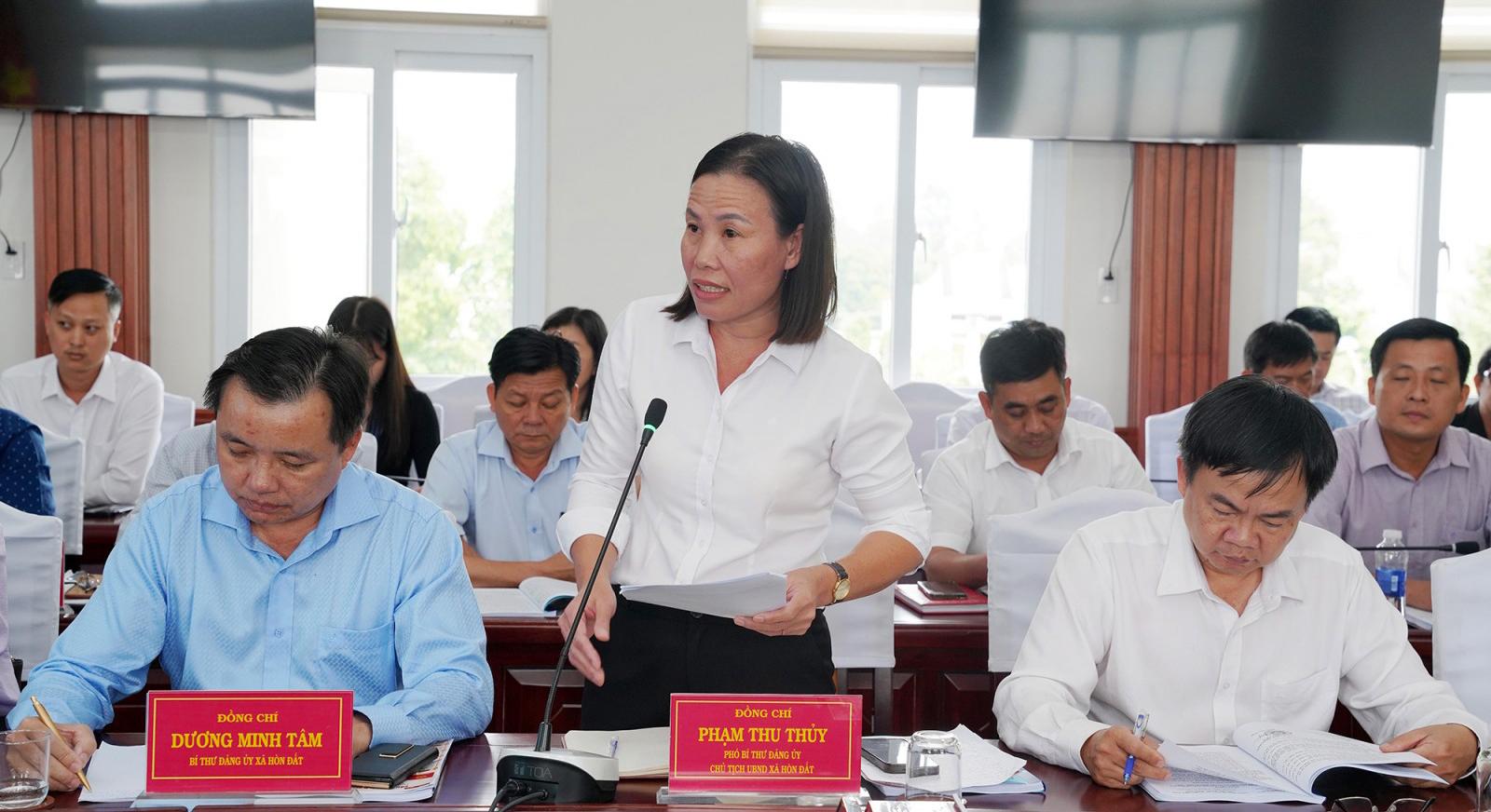 Chủ tịch UBND xã, Chủ tịch Ủy ban bầu cử xã Hòn Đất Phạm Thu Thủy báo cáo tiến độ triển khai thực hiện công tác bầu cử.