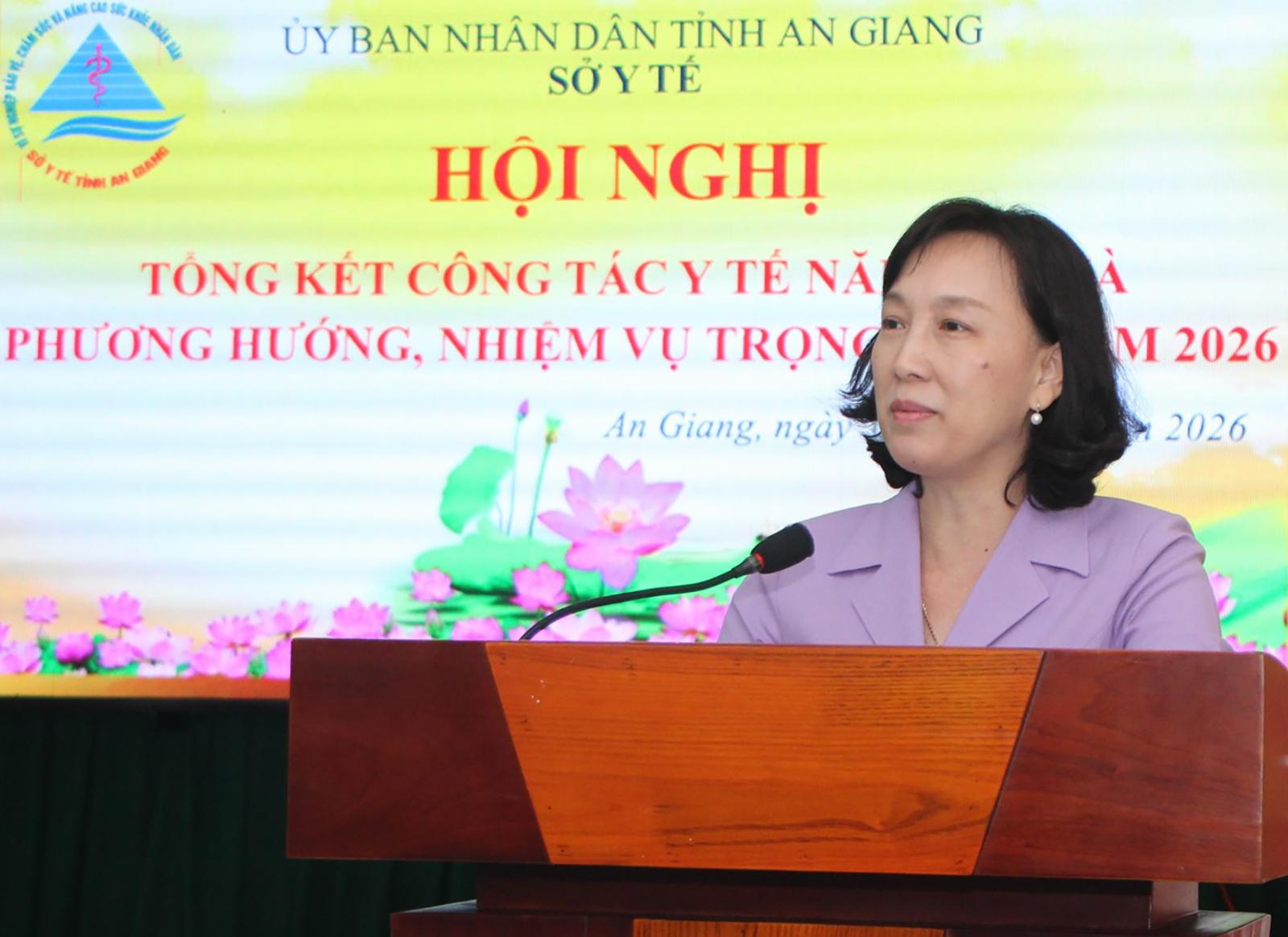 Phát biểu chỉ đạo hội nghị, Phó Chủ tịch UBND tỉnh An Giang Nguyễn Thị Minh Thúy biểu dương và đánh giá cao thành quả ngành y tế đạt được. Giai đoạn 2026 - 2030, ngành y tế An Giang đứng trước yêu cầu phát triển mới, cao hơn, toàn diện hơn, hướng đến xây dựng và phát triển hệ thống y tế An Giang toàn diện, hiện đại, công bằng, bền vững, bảo đảm mọi người dân đều được tiếp cận dịch vụ y tế có chất lượng.