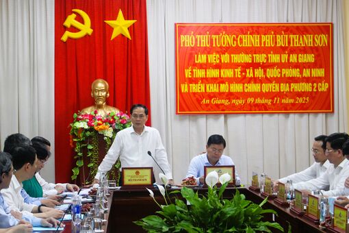 Chiều 9/11, tại Ban Quản lý Di tích văn hóa Óc Eo (tỉnh An Giang), đoàn công tác Trung ương do Ủy viên Ban Chấp hành Trung ương Đảng, Phó Thủ tướng Chính phủ Bùi Thanh Sơn dẫn đầu đoàn làm việc với Thường trực Tỉnh ủy An Giang về tình hình kinh tế - xã hội, quốc phòng, an ninh và triển khai mô hình chính quyền địa phương hai cấp trên địa bàn tỉnh.