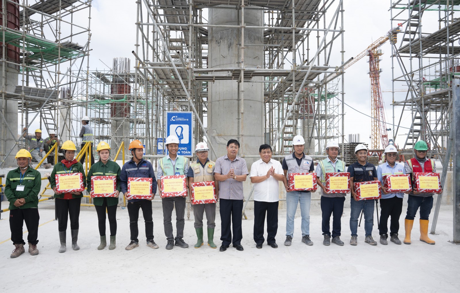 Phó Thủ tướng Chính phủ Nguyễn Chí Dũng và Bí thư Tỉnh ủy An Giang Nguyễn Tiến Hải tặng quà công nhân thi công Trung tâm tổ chức Hội nghị APEC (Ảnh: TRUNG HIẾU)