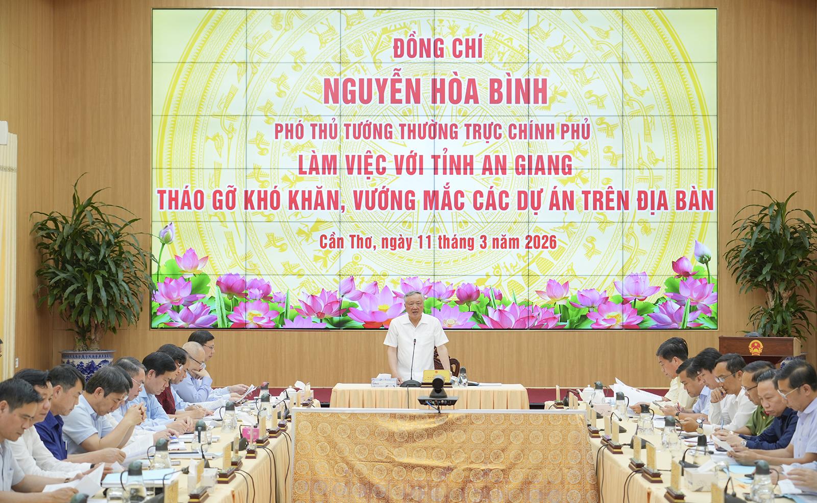 Phó Thủ tướng Thường trực Chính phủ Nguyễn Hòa Bình làm việc với UBND tỉnh An Giang để tháo gỡ khó khăn, vướng mắc cho các dự án trên địa bàn.