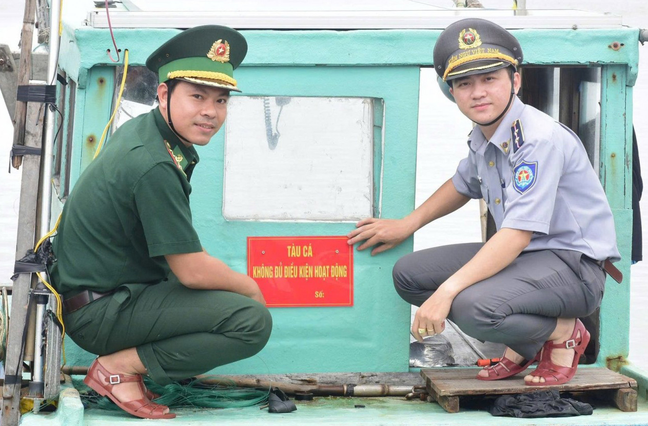 Lực lượng kiểm ngư phối hợp biên phòng đóng bảng giám sát tàu không đủ điều kiện hoạt động.