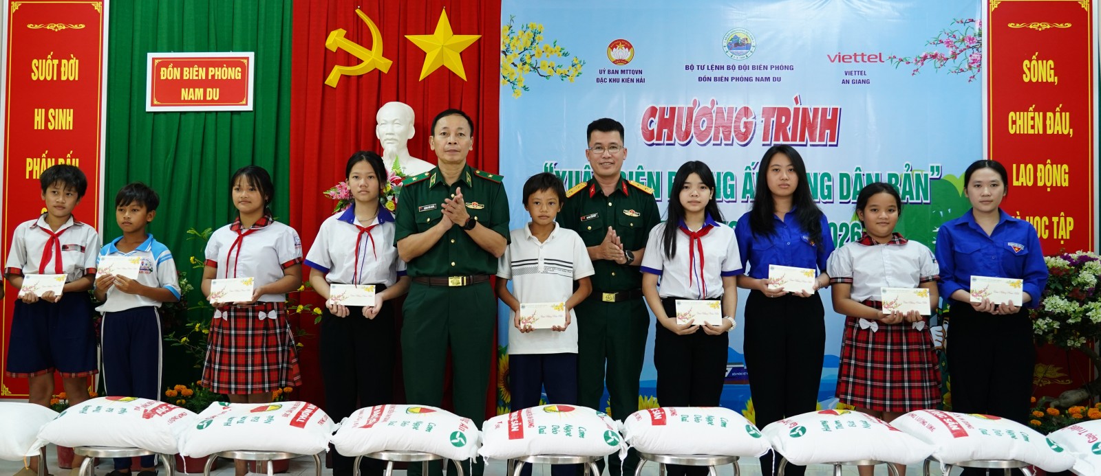 Tham dự chương trình “Xuân Biên phòng ấm lòng dân bản” năm 2026 do Đồn Biên phòng Nam Du tổ chức, Thiếu tướng Hoàng Hữu Chiến đại diện trao 70 phần quà Tết của Bộ Tư lệnh cho các hộ gia đình chính sách, hộ nghèo, trẻ em có hoàn cảnh khó khăn.