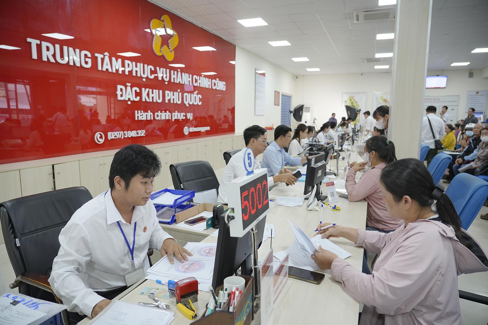 Cán bộ giải quyết thủ tục hành chính tại Trung tâm Phục vụ hành chính công đặc khu Phú Quốc (An Giang).