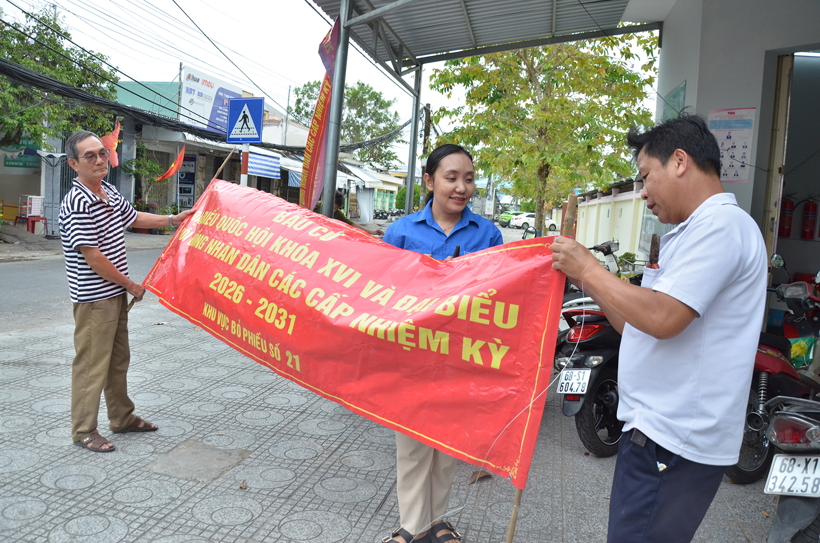 Chị Nguyễn Thị Mỹ Tiên - Bí thư Chi đoàn khu phố Lê Thị Hồng Gấm, phường Rạch Giá tham gia treo băng rôn tuyên truyền bầu cử. Ảnh: MI NI