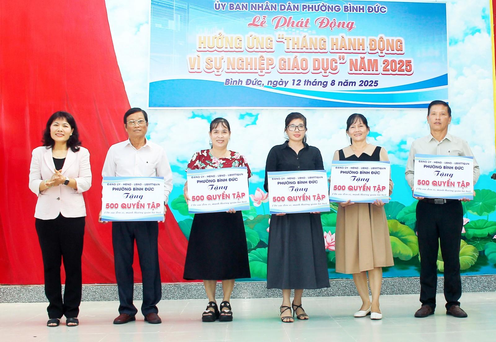 Bí thư Đảng ủy, Chủ tịch HĐND phường Bình Đức Trần Thị Ngọc Diễm trao tặng tập cho đại diện các trường.