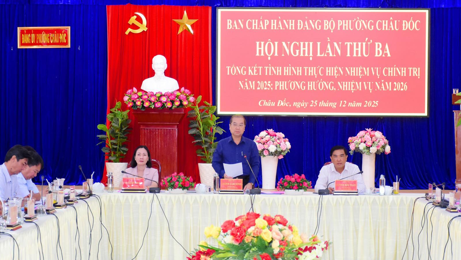 Năm 2025, phường Châu Đốc thực hiện thắng lợi 13/13 chỉ tiêu phát triển kinh tế - xã hội, trong đó có 5 chỉ tiêu vượt so nghị quyết đề ra. Công tác xây dựng Đảng, hệ thống chính trị đạt nhiều kết quả tích cực; lĩnh vực văn hóa - xã hội có nhiều khởi sắc, quốc phòng - an ninh được giữ vững…