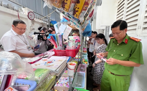 Song song đó, đoàn trực tiếp khảo sát khu vực sơ chế, chế biến và phục vụ ăn uống, đánh giá điều kiện vệ sinh, trang thiết bị, dụng cụ sử dụng trong chế biến, cũng như kiểm tra hạn sử dụng và nguồn gốc các mặt hàng bày bán tại căn tin.