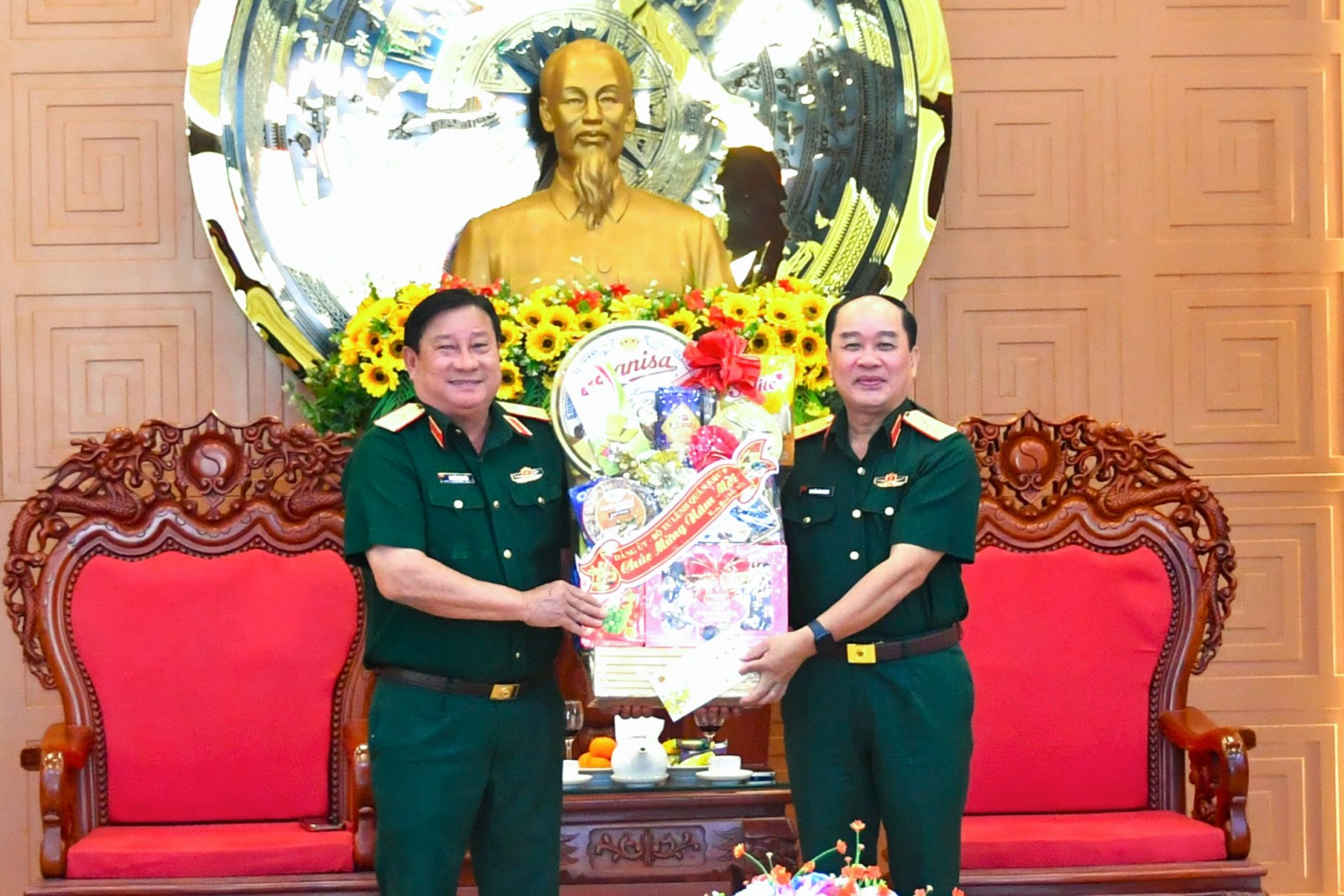 Thiếu tướng Nguyễn Văn Tiền, Phó Tư lệnh Quân khu 9 chúc tết, tặng quà cho Bộ Chỉ huy Quân sự tỉnh An Giang.