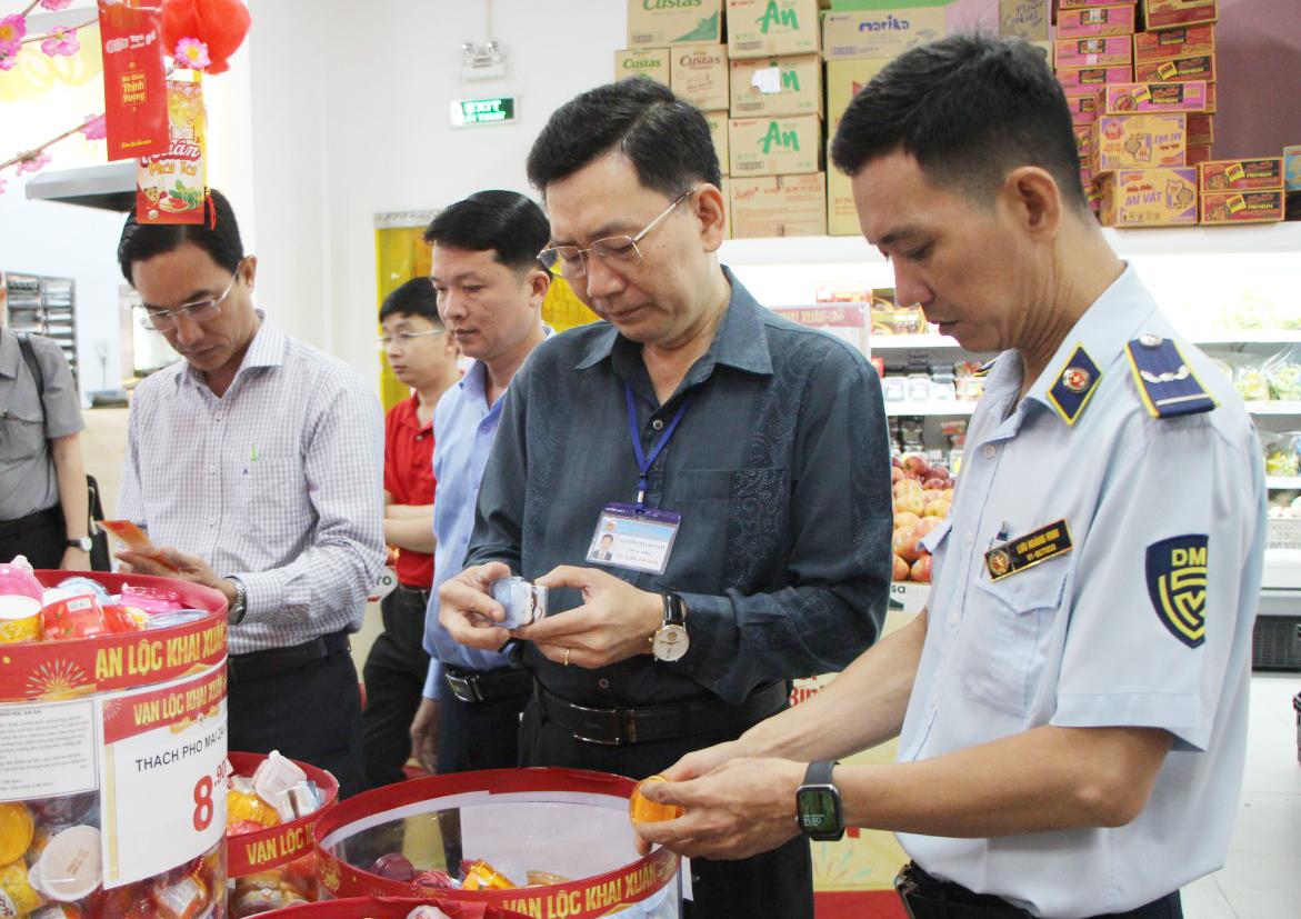 Đoàn kiểm tra đột xuất các sản phẩm bày bán tại siêu thị, tập trung những mặt hàng được sử dụng nhiều trong dịp Tết Nguyên đán và các lễ hội như thịt và các sản phẩm từ thịt, bia, rượu, thức uống có cồn, nước giải khát, bánh, mứt, kẹo, rau, củ, quả, phụ gia thực phẩm...; lương thực, thực phẩm thiết yếu.