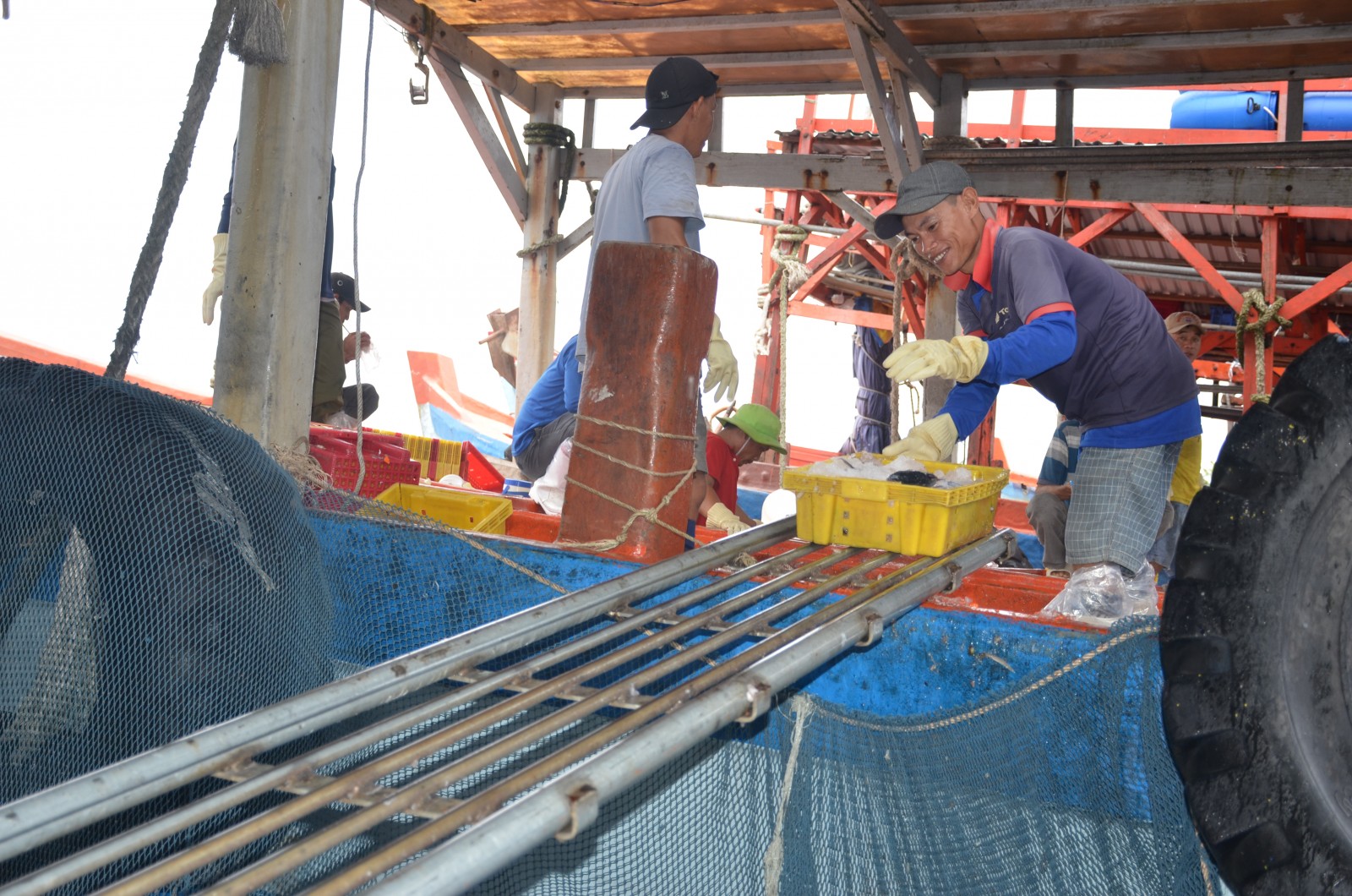Công nhân bốc dỡ thủy sản tại cảng cá Tắc Cậu, xã Bình An.