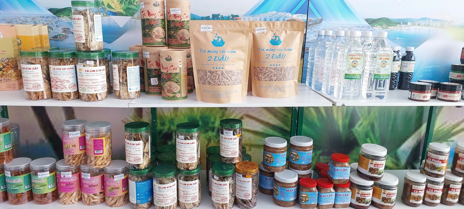 Các sản phẩm được trưng bày khá phong phú, như: Nước mắm, cá đóng hộp, muối sấy, gạo, sản phẩm chế biến từ trái nhàu, sản phẩm dịch vụ du lịch…