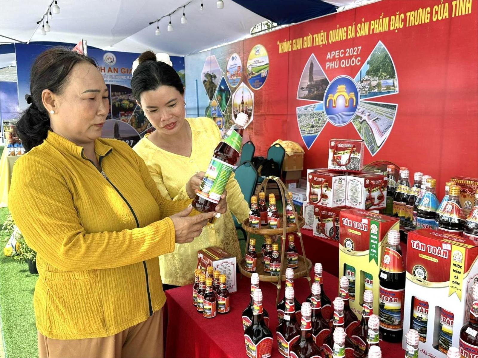 Du khách tham quan, tìm hiểu sản phẩm nước mắm tại không gian trưng bày sản phẩm đặc trưng tỉnh An Giang. Ảnh: THÙY TRANG