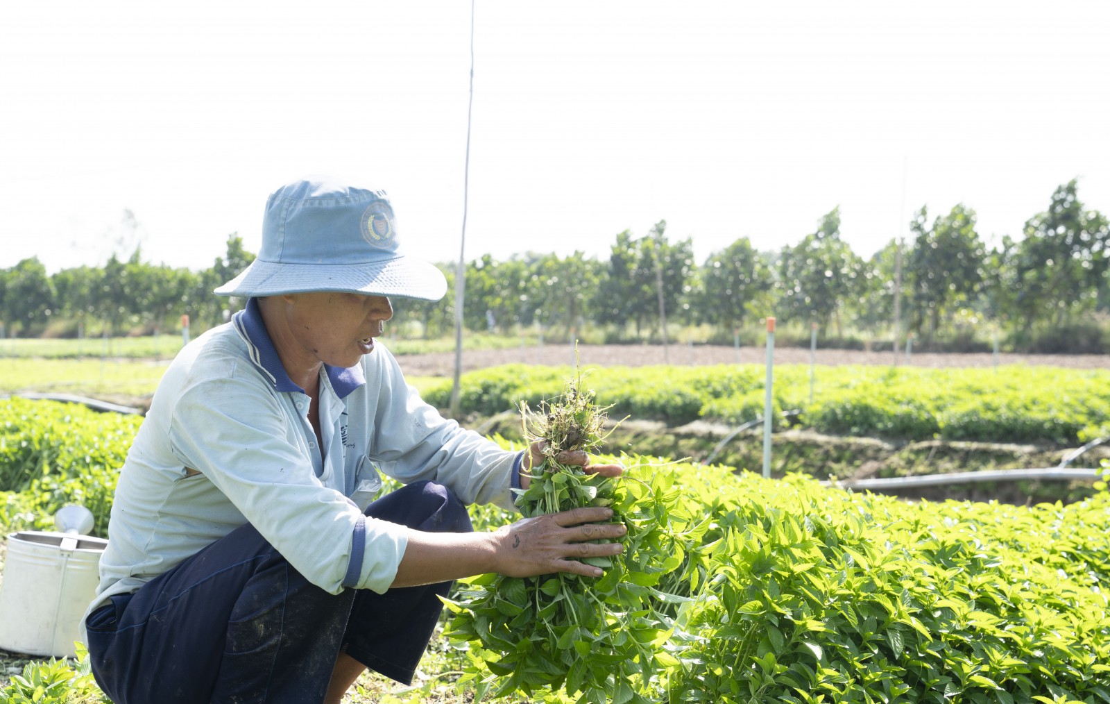 Ông Nguyễn Xuân Hoàng thu hoạch rau thơm.
