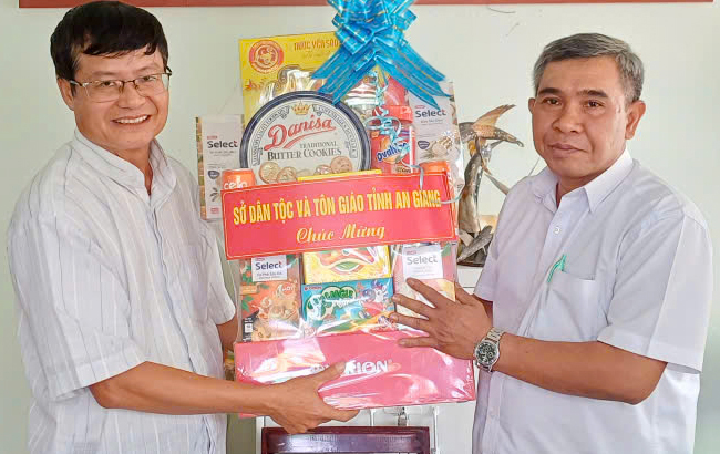 Phó Giám đốc Sở Dân tộc và Tôn giáo tỉnh An Giang Danh Lắm (bên phải) tặng quà Giáo xứ An Bình, xã Gò Quao.
