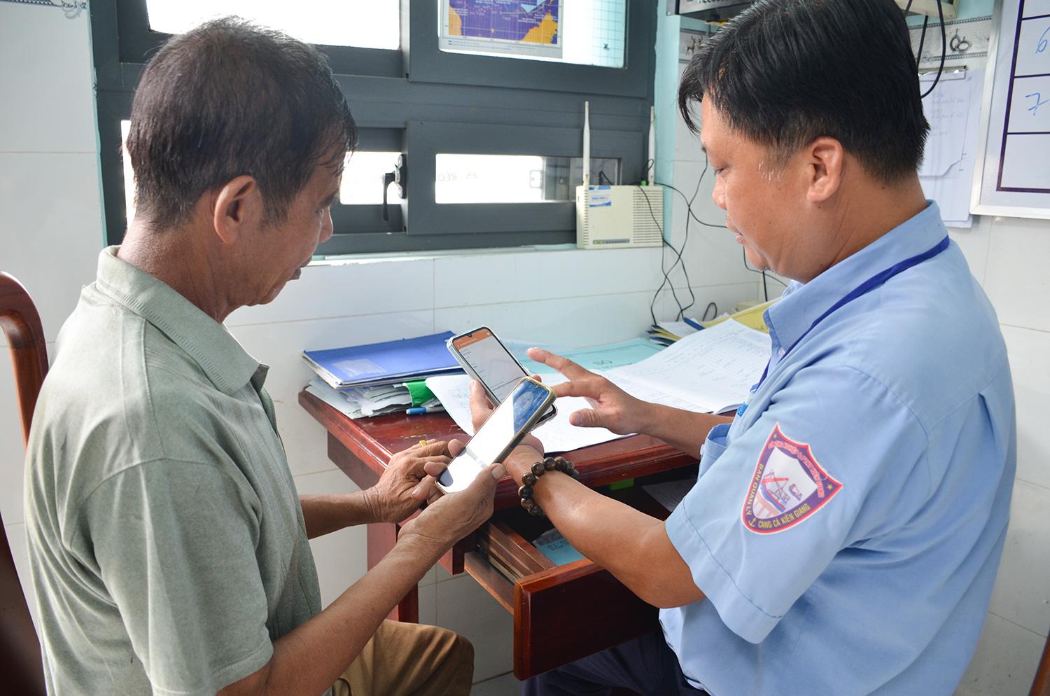 Nhân viên cảng cá Tắc Cậu hướng dẫn ngư dân khai báo thủ tục xuất nhập cảng thông qua ứng dụng eCDT. Ảnh: THÙY TRANG