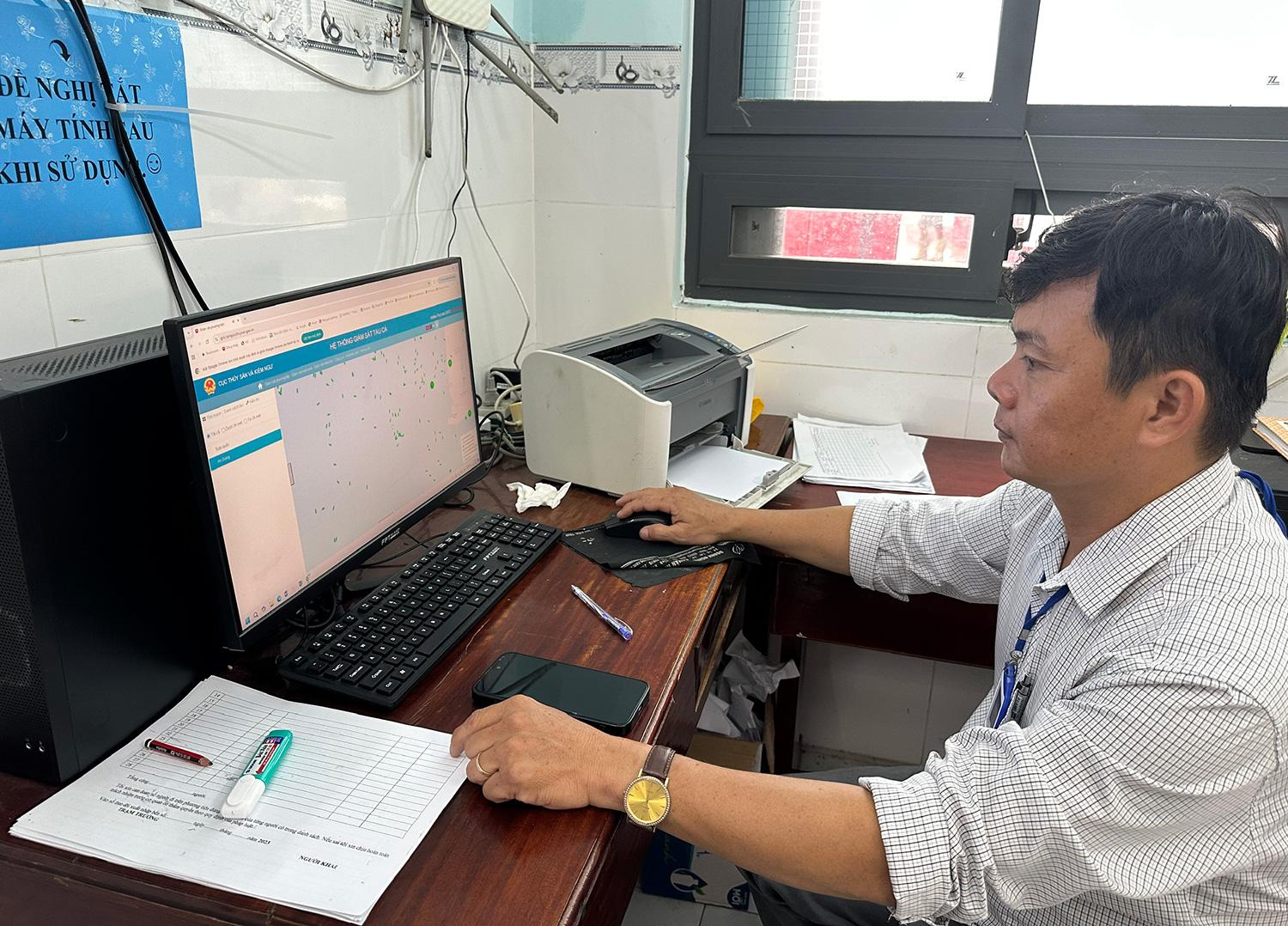 Nhân viên cảng cá Tắc Cậu theo dõi tín hiệu tàu cá trên hệ thống giám sát hành trình. Ảnh: THÙY TRANG