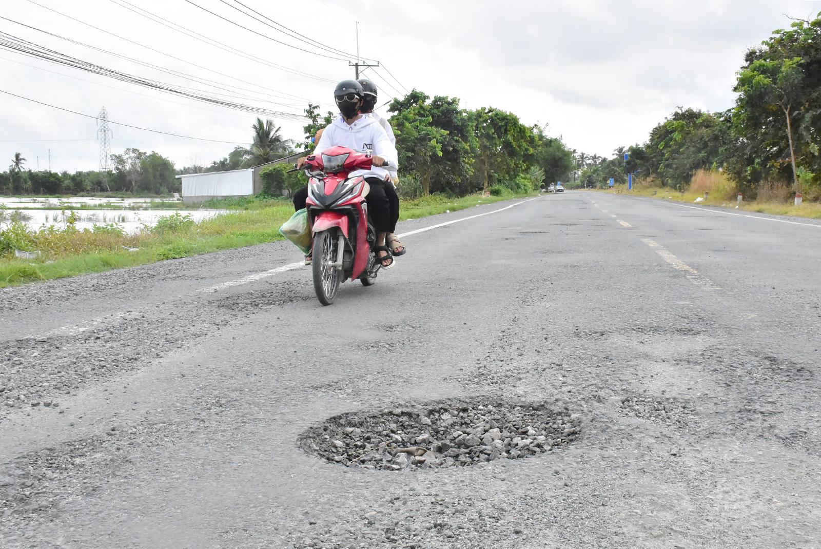 Nhiều đoạn trên tuyến Quốc lộ 61, đoạn Bến Nhứt - cầu Rạch Tìa chằng chịt ổ gà, tiềm ẩn nguy cơ mất an toàn giao thông.