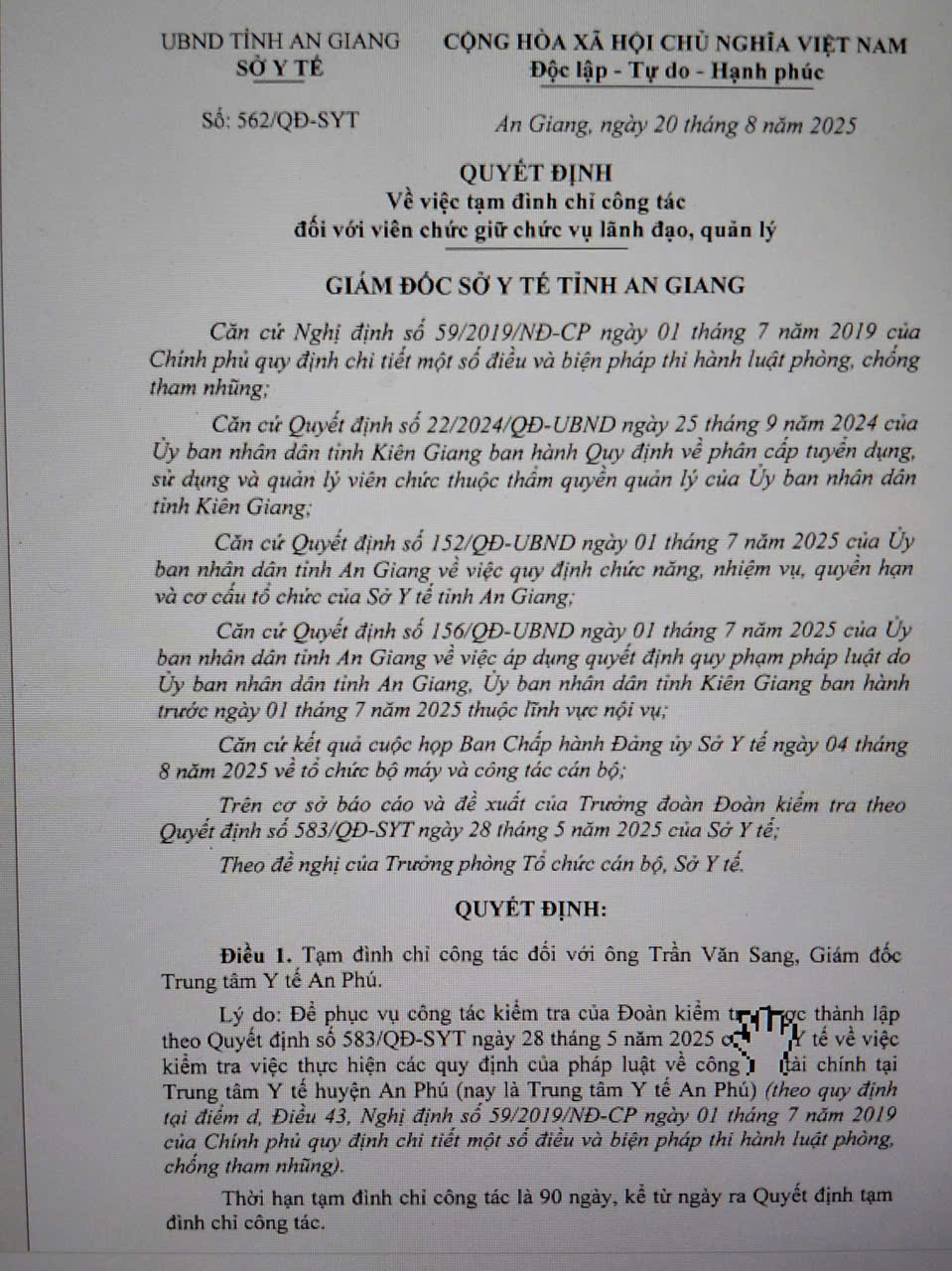 Cụ thể, tạm đình chỉ công tác đối với Giám đốc Trung tâm Y tế An Phú Trần Văn Sang 90 ngày để phục vụ công tác kiểm tra của đoàn kiểm tra được thành lập theo Quyết định 583/QĐ-SYT của Sở Y tế tỉnh về việc kiểm tra việc thực hiện các quy định của pháp luật về công tác tài chính tại Trung tâm Y tế huyện An Phú (nay là Trung tâm Y tế An Phú); đồng thời, làm rõ một số nội dung mà các cán bộ Trung tâm Y tế An Phú đã tố cáo.