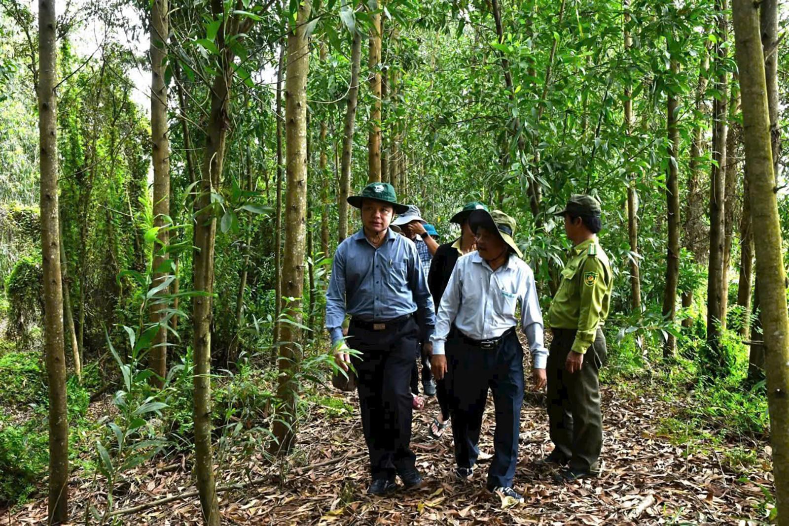 Ngành kiểm lâm tỉnh kiểm tra rừng. Ảnh: THÙY TRANG