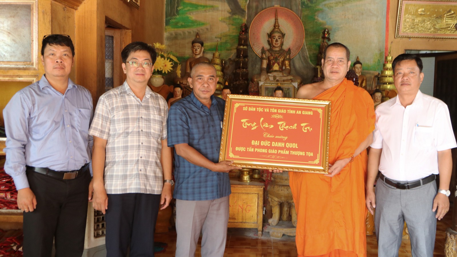 Sở Dân tộc và Tôn giáo tỉnh An Giang tặng Thượng tọa Danh Quol bức khánh với dòng chữ “Tòng lâm thạch trụ”.