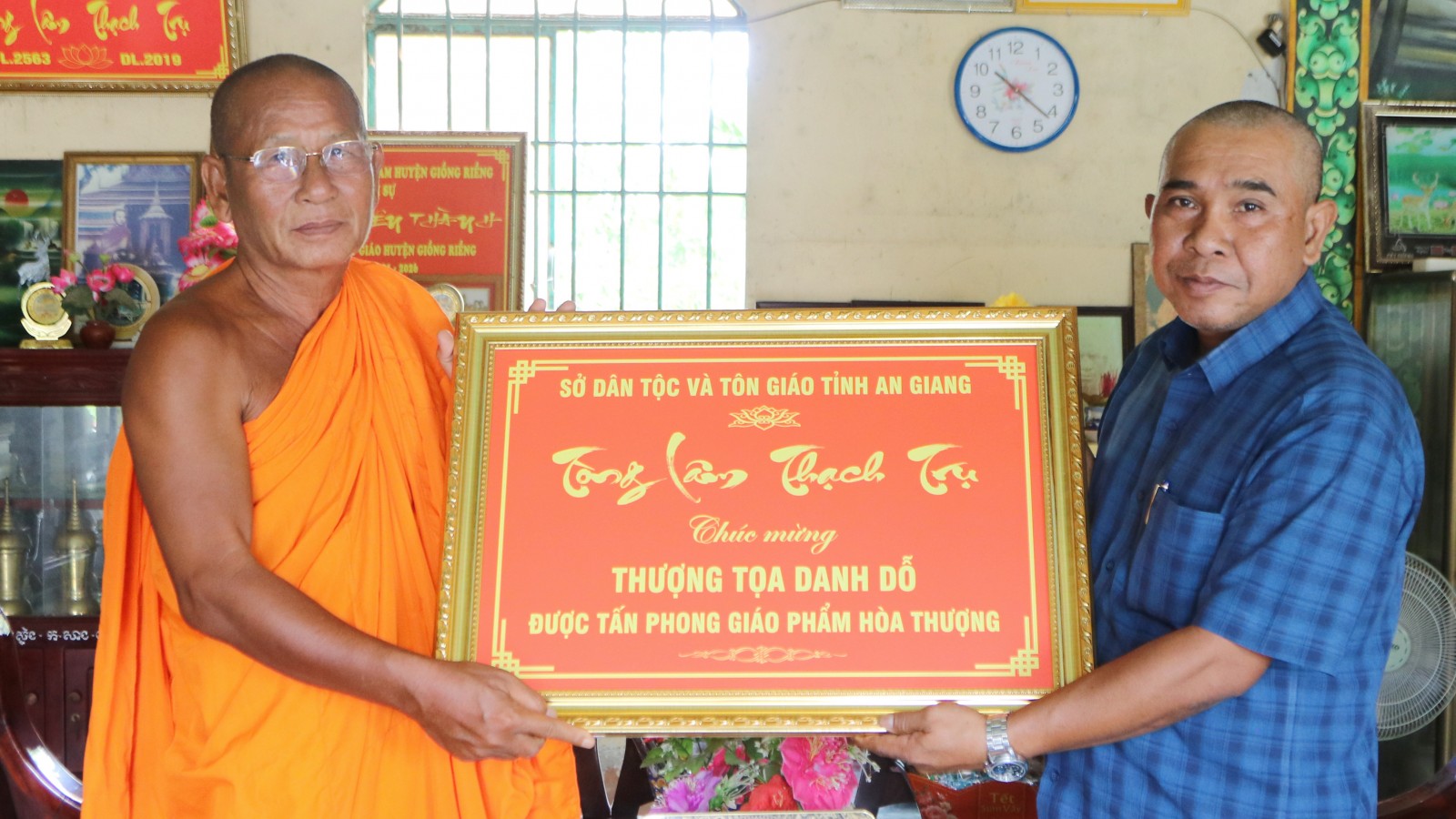 Ông Danh Lắm, Phó Giám đốc Sở Dân tộc và Tôn giáo tỉnh An Giang (bên phải) tặng bức khánh chúc mừng Hòa thượng Danh Dỗ, trụ trì chùa Cây Trôm.