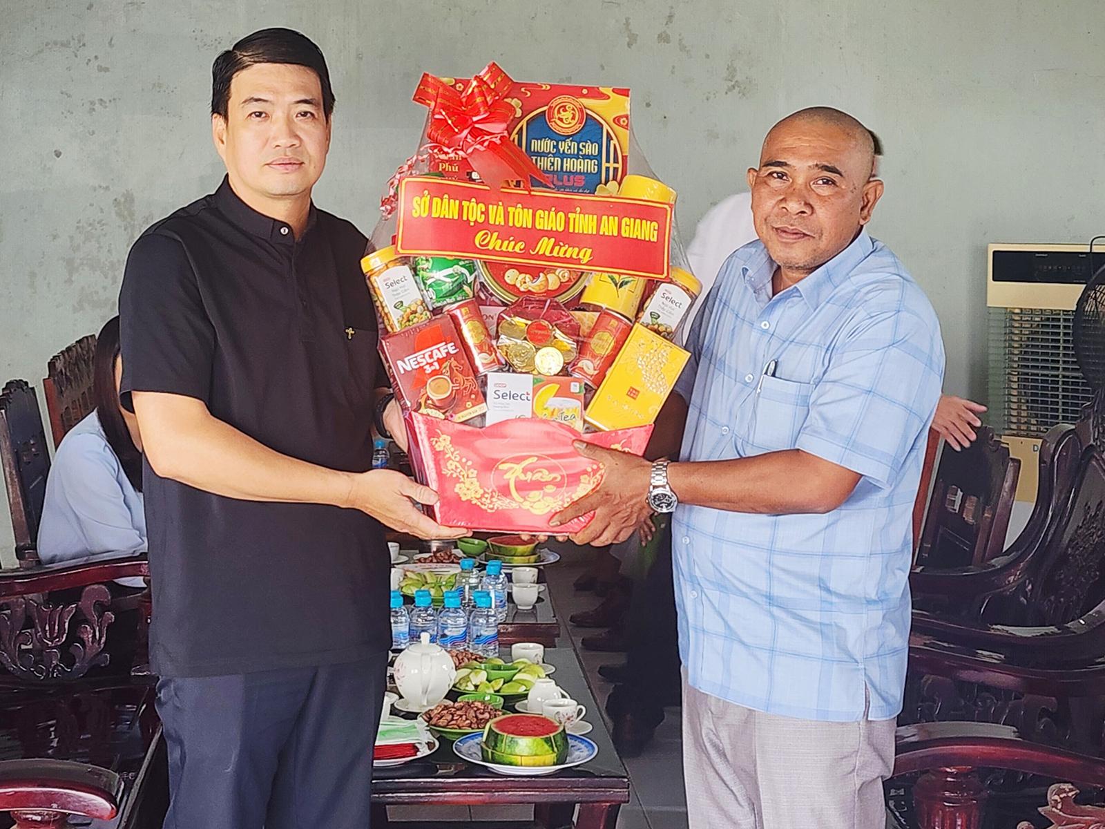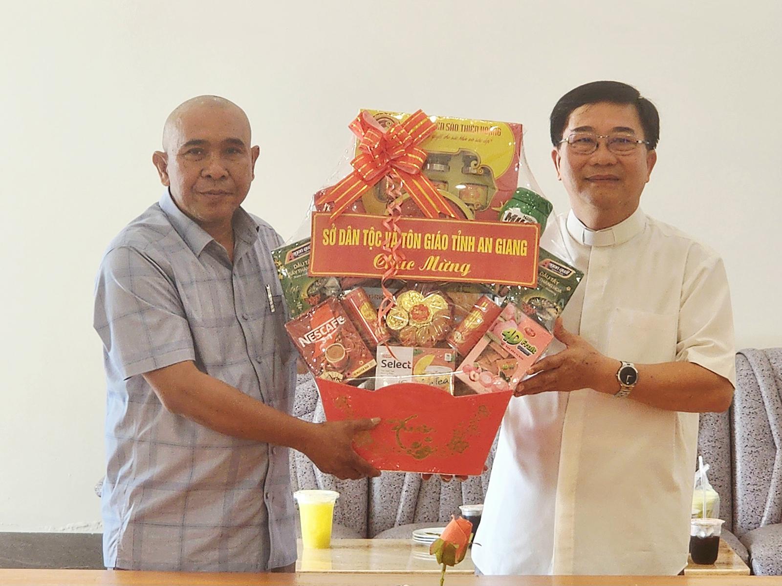 Phó Giám đốc Sở Dân tộc và Tôn giáo tỉnh An Giang Danh Lắm (bên trái) tặng quà Linh mục Phạm Xuân Hoàng, Hạt trưởng Hạt Tân Hiệp, Chánh xứ Giáo xứ Đài Đức Mẹ.