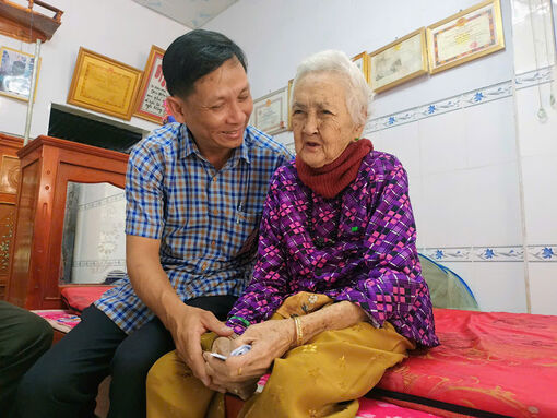 Bí thư Đảng ủy, Chủ tịch HĐND xã Vĩnh Thạnh Trung Nguyễn Duy Đức thăm Mẹ Việt Nam Anh hùng La Thị Lên.